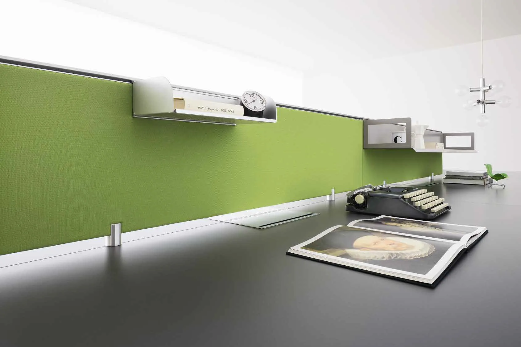 Point is a multiple office workstation with fabric screens with trinket trays.