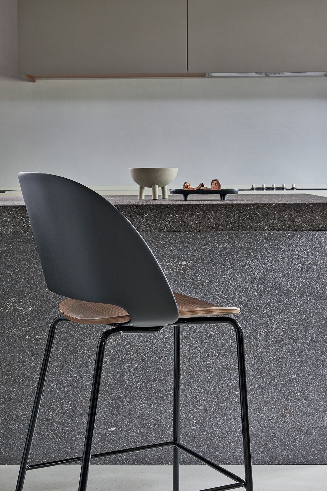 Polo is a barstool with metal frame. Back in polypropylene and seat in Solid wood or upholstered and covered seat in Premium Eco leather, Bouquet fabric, Gourmet fabric, Nordic fabric, Pure Virgin Wool, Supreme Velvet, Kvadrat Field fabric, Coda Fabric and Premium Leather.