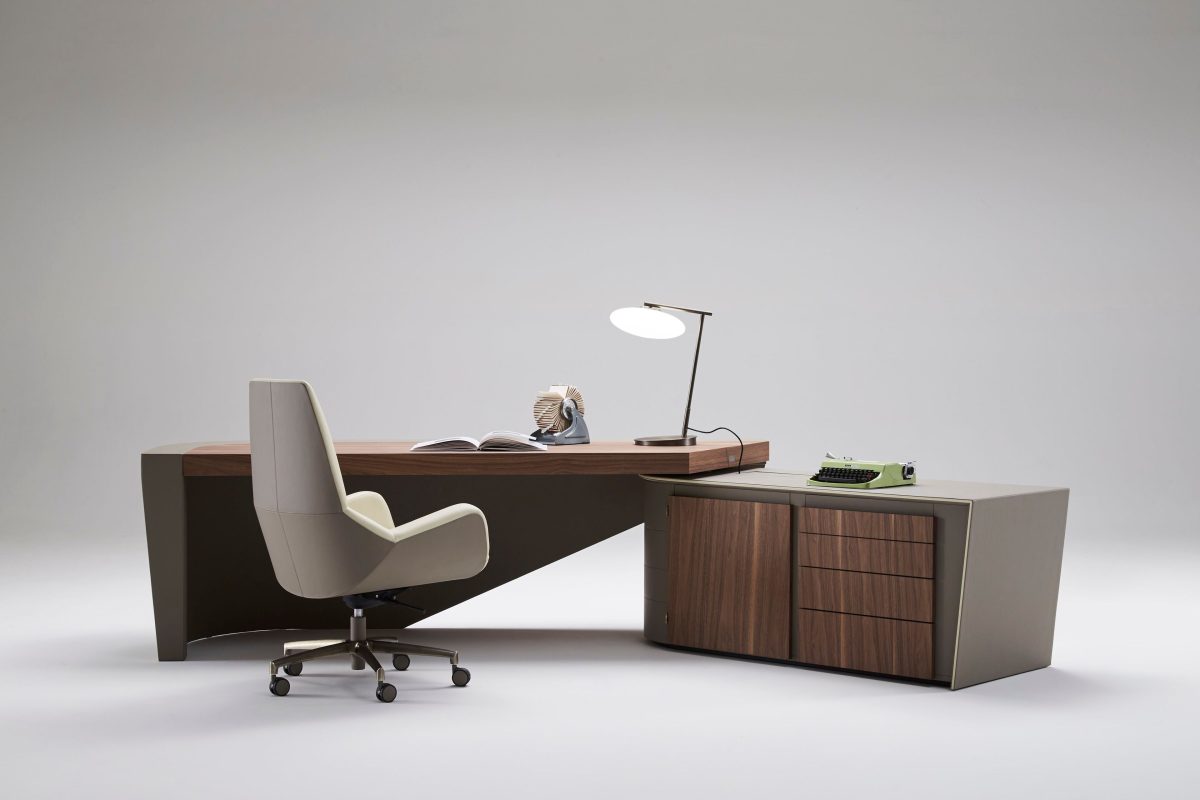 Portofino is a leather-covered wooden desk inspired by the planking of a hull, without traditional edges, with lines that remind the boats and therefore the sea. Portofino is a large working promontory, a desk of big dimensions for an office with refined lines. However, its majesty is lightened by the sideboard resting on the peninsula. Portofino has a multilayered wooden structure, while the top and the drawer fronts are in wood essence. The front and the profile of the top are covered in leather. The desk, customizable as in the data sheet, has the predisposition for USB ports.