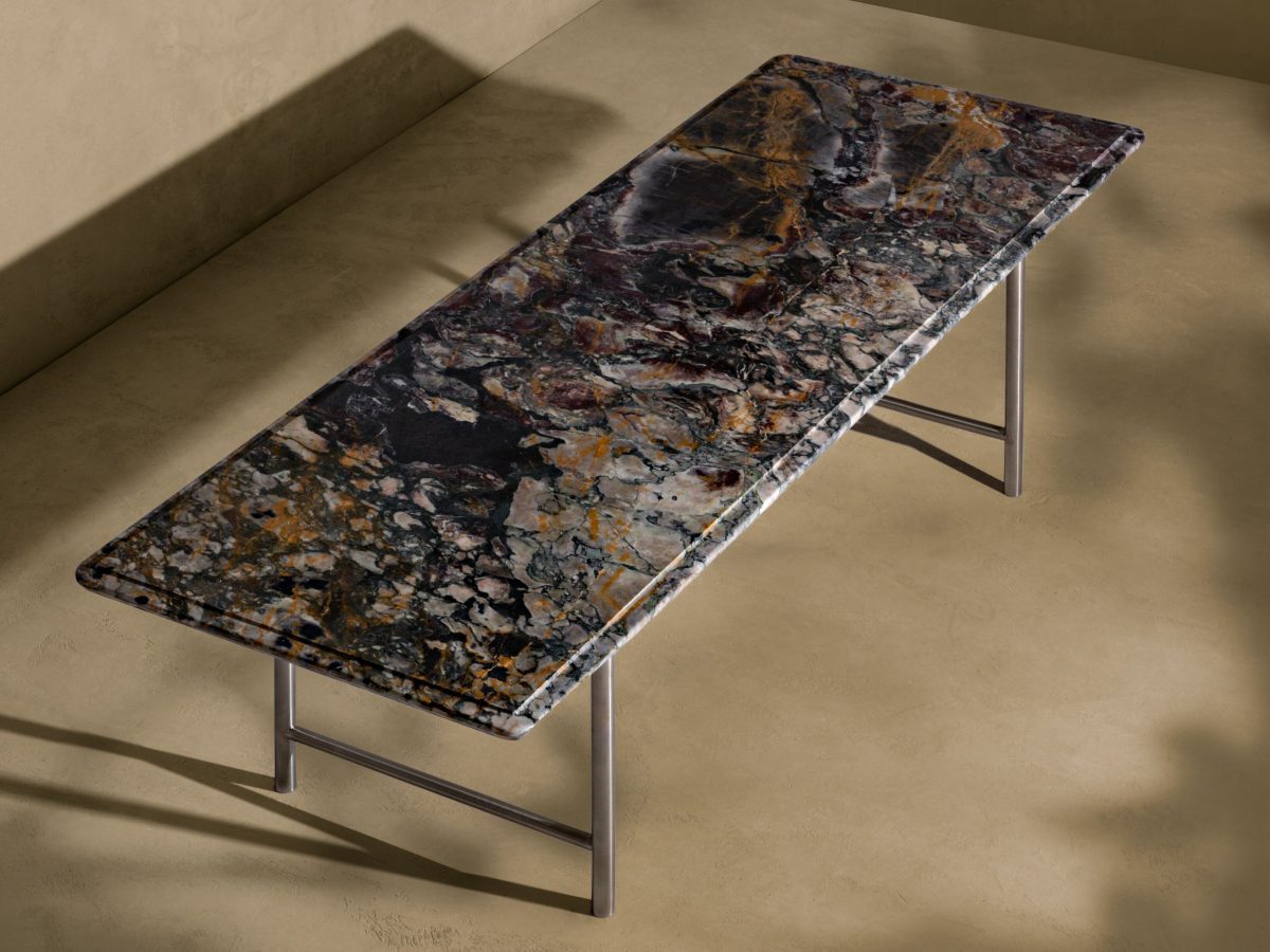 The extraordinary multicolours and intense shades of Vendome Breccia contrasts the minimalism of the Prince table, designed by Christophe Pillet, and characterises its top. The surface has a unique collage of fragments of different types of stone, with accents of dark red, green, golden yellow and black. Its a natural, stony work of art, offering the perfect antithesis to the slender, light metal structure. The base is made of satin finished stainless steel, and features two trestles where the top, proposed in the 250×90 cm size, rests.