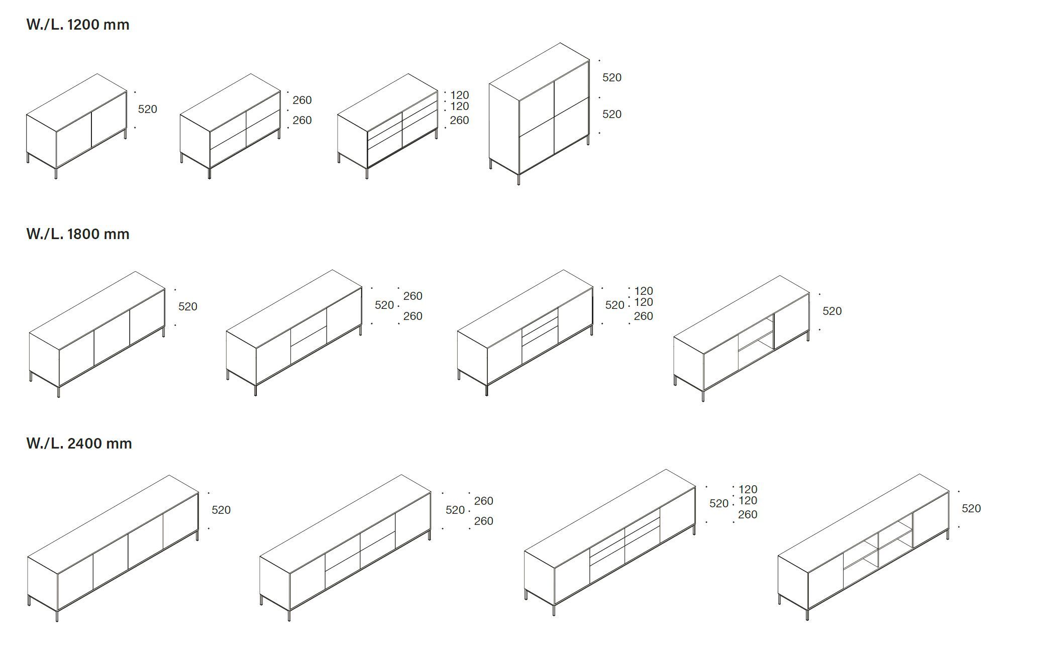 Quadra units are available in three widths and two heights, allowing tailored configurations for various needs. With a total height of 560 mm and a width of 1200/1800/2400 mm, they offer ample storage without overwhelming the environment.