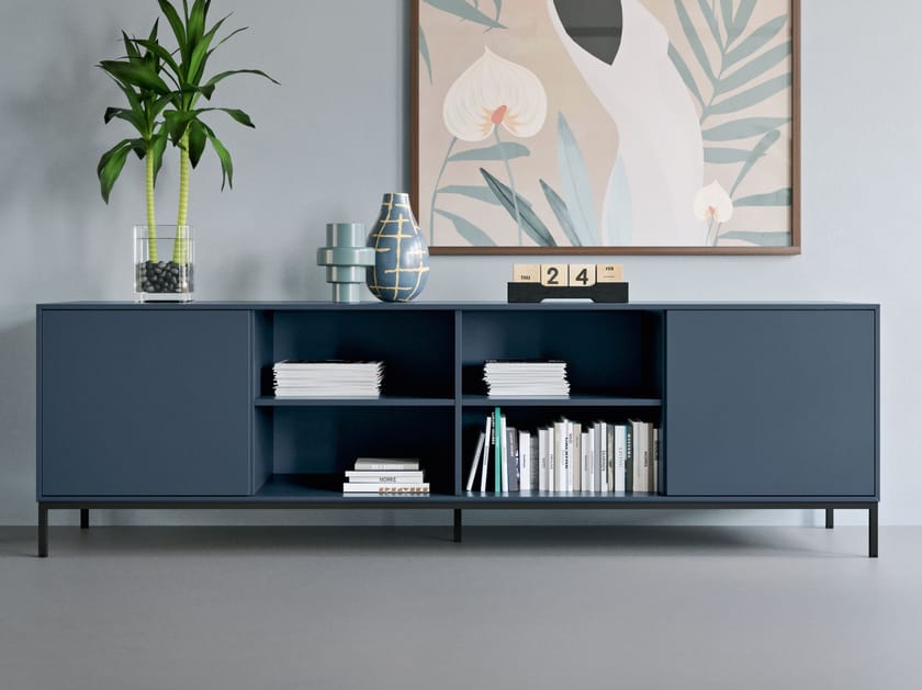Quadra is a matte lacquered in Blu Notte 437 sideboard, on base with black metal legs. The sideboard is available in three widths and two heights for total customization.