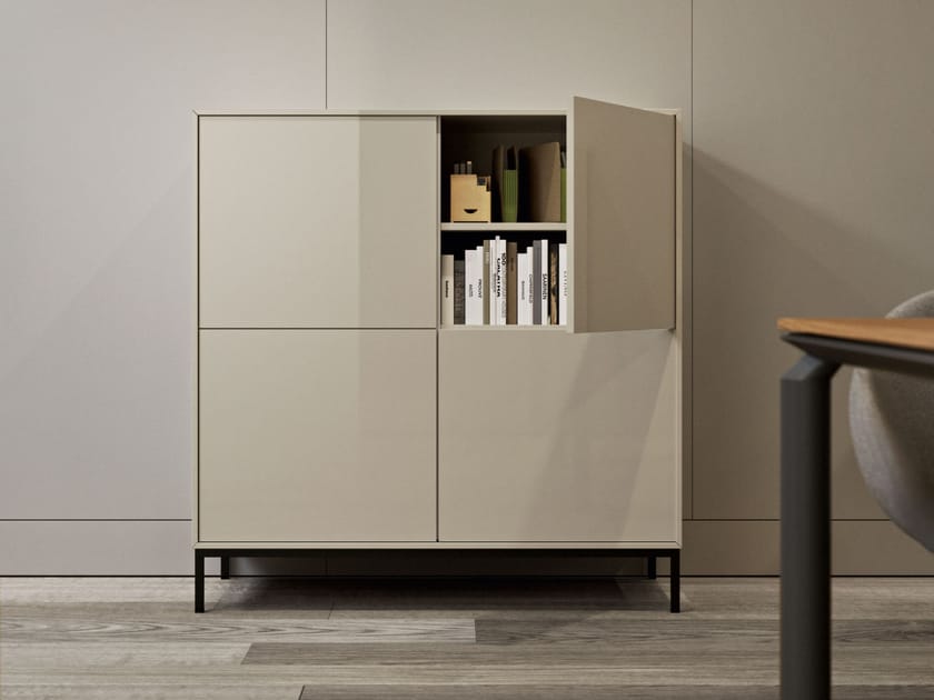 Quadra is a Crema 333 glossy lacquered sideboard resting on a base with black metal legs. The sideboard is available in three widths and two heights for total customization.