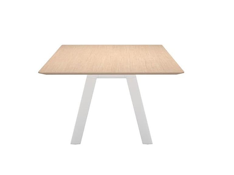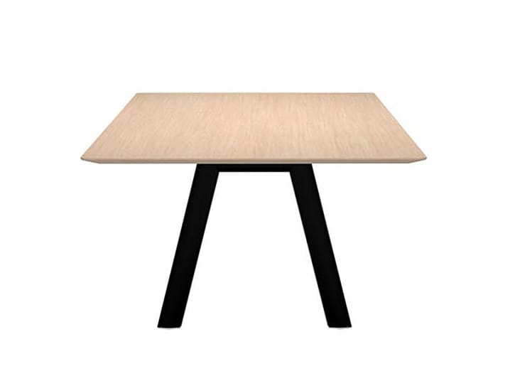 Table program available with different types of bases and tabletops. Base of aluminum legs available in polished aluminum, anodized, white or black. Plywood