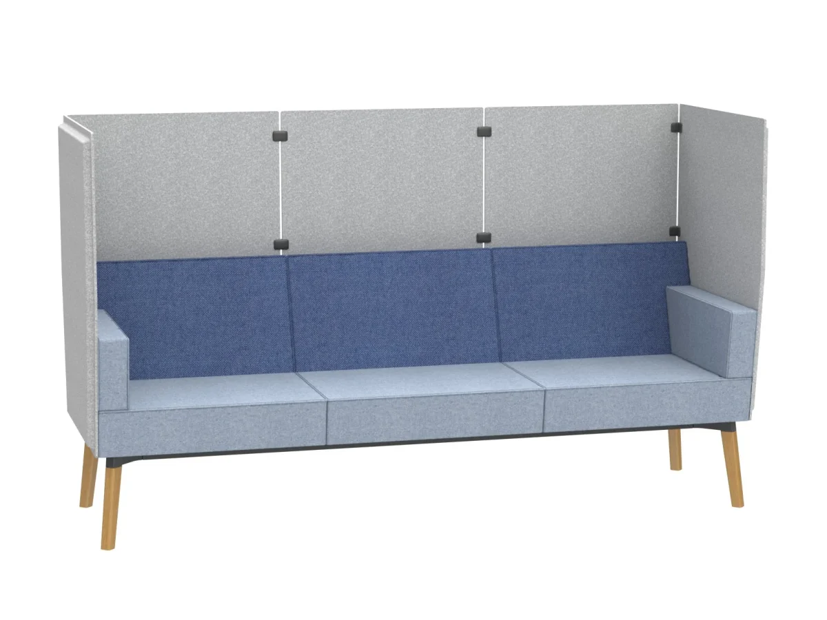 3-seater bench with privacy screen and feet in natural oak, optional black painted or polished aluminum. Overall width 224 cm.