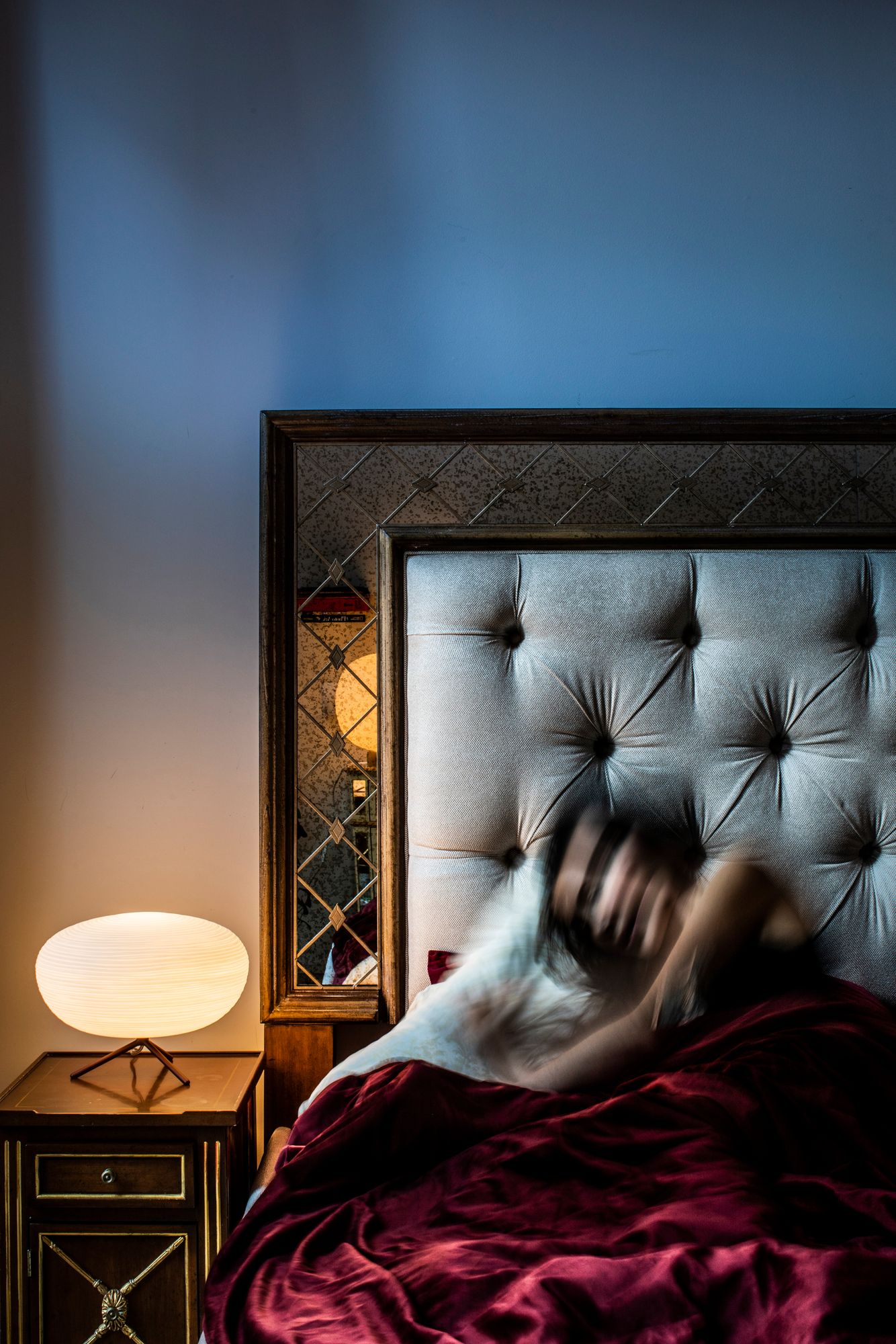 Rituals 2 is a table lamp made of blown engraved satin glass and varnished metal.