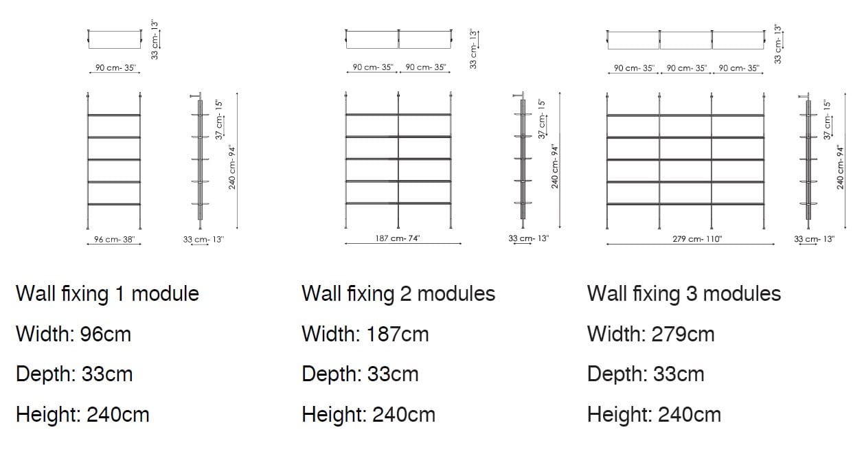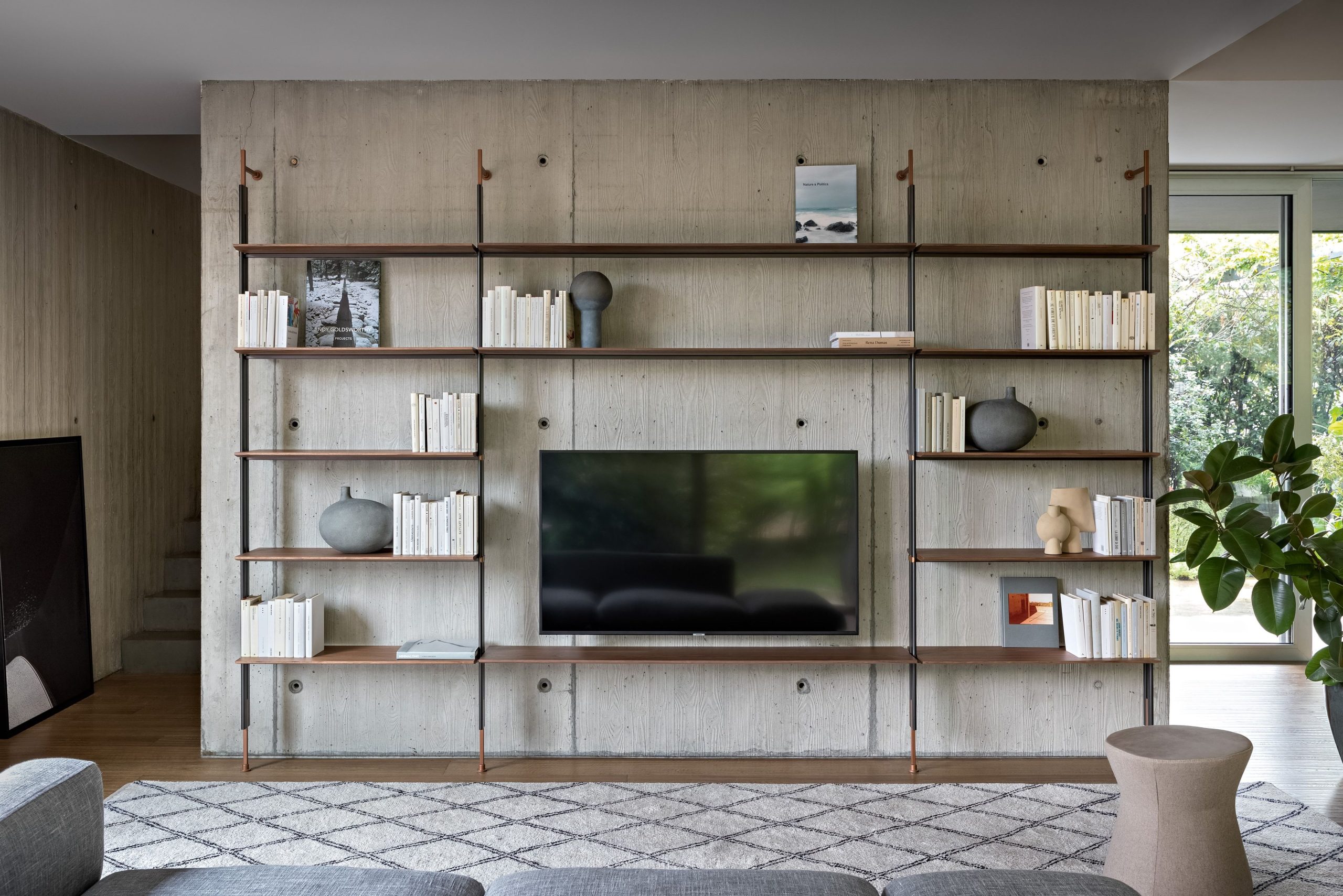 The ability to fix Roll bookcase to the ceiling, as well as to the wall, makes it a furnishing element that can also be installed in the centre of a room to divide it into two spaces. Mounting it to the wall takes place by means of supports composed of metal tubes with lead finish; both the shelves and the details that come out of the metal tubes are available in the same finish as the supports or in different finishes, for a play of contrasts of utmost elegance. The modularity of the Roll bookcase makes it suitable for any size wall, both in the home or office.