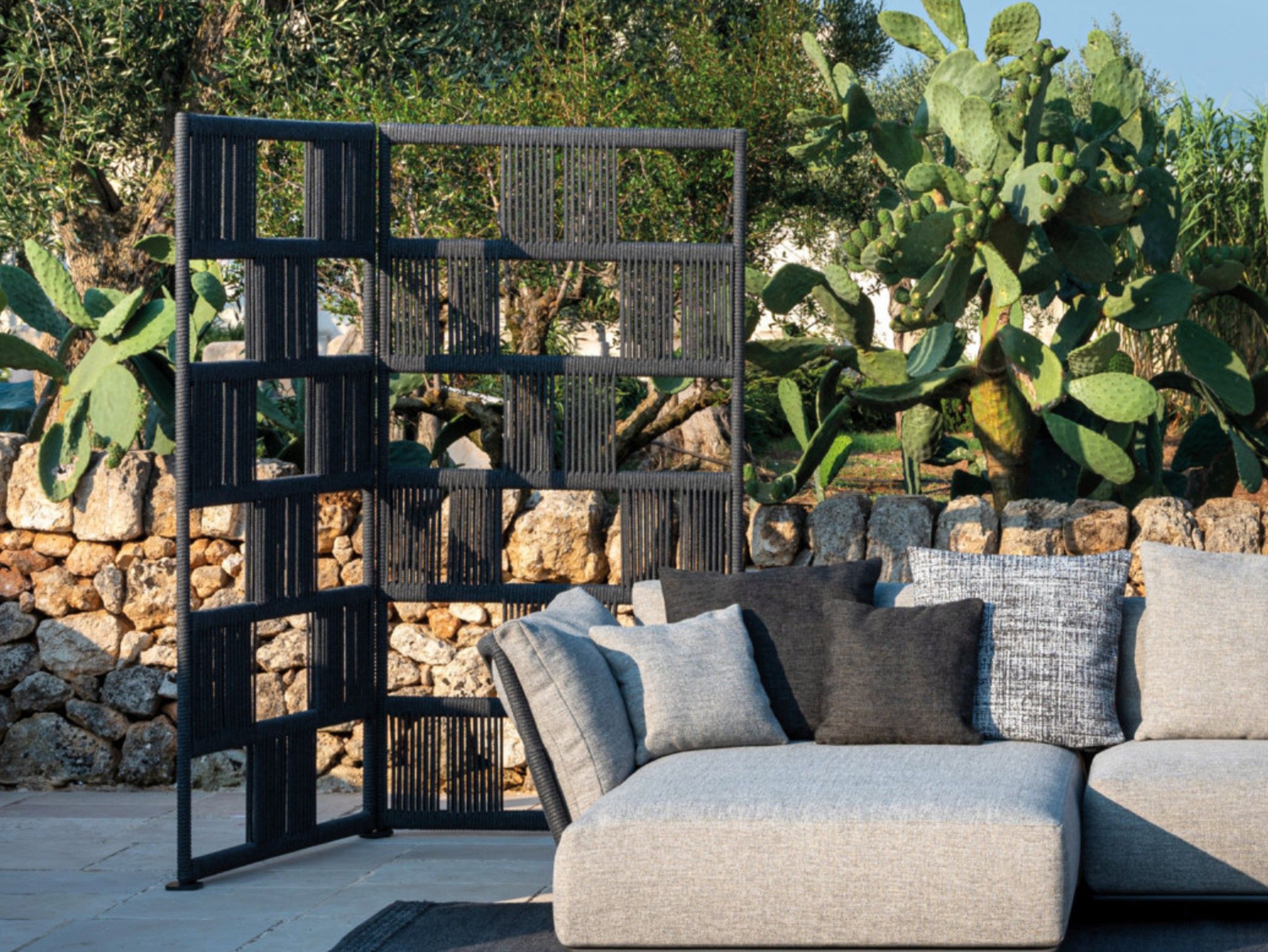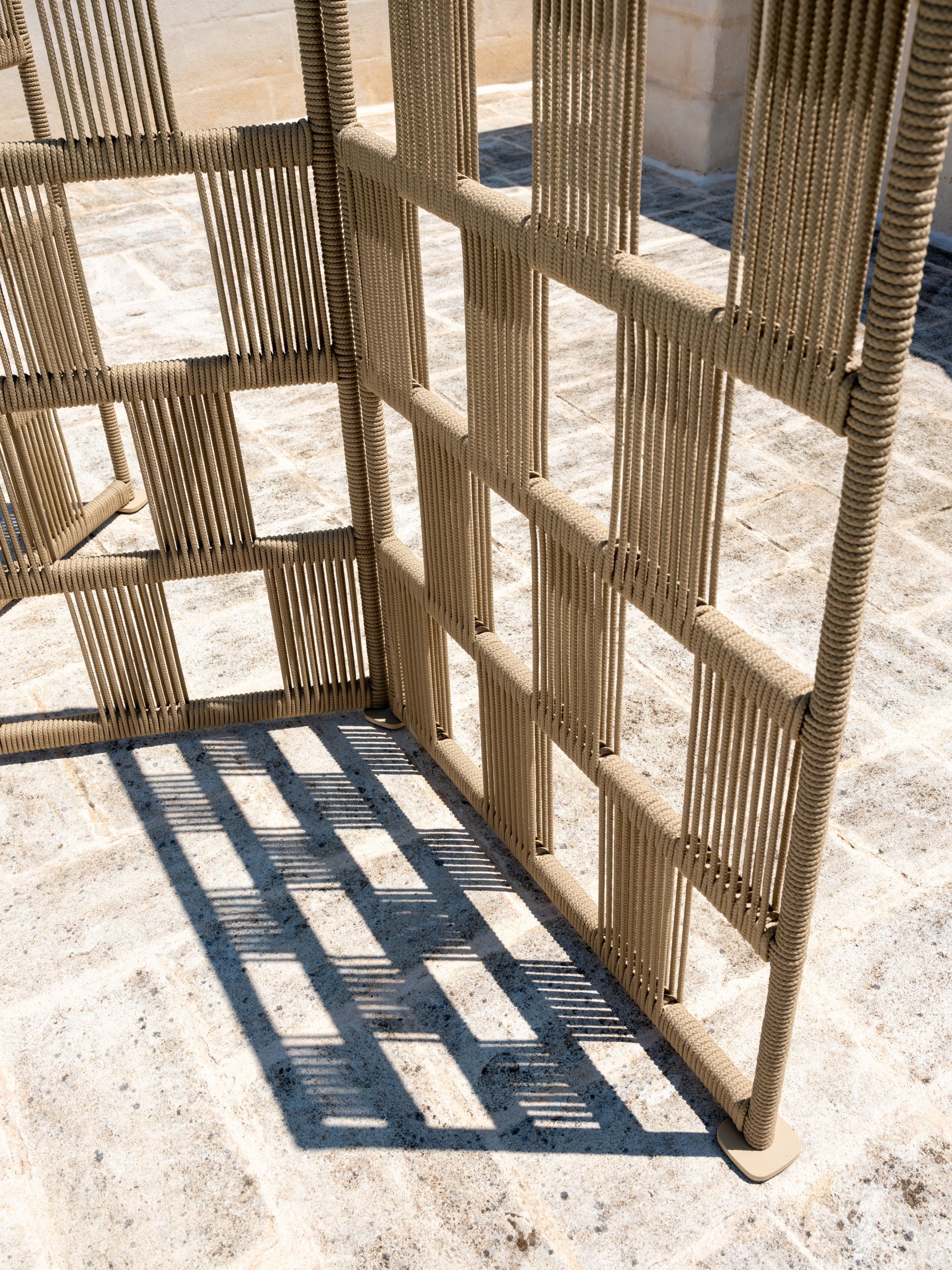 Ideal for customizing an outdoor setting, the Partition from the Scacco collection is distinguished by its height. The geometric pattern, reminiscent of a chessboard, is made of aluminum covered with synthetic nautical ropes.