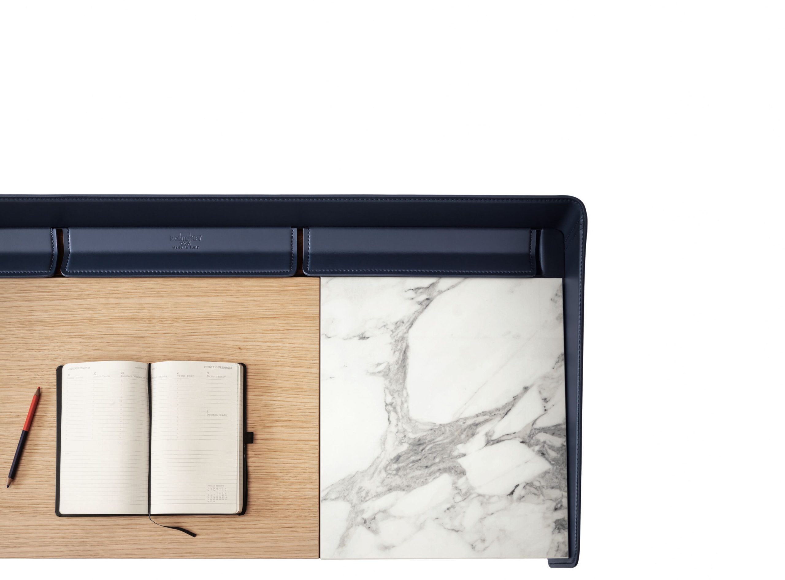 Secret is a desk with frame and outer edge in lacquered metal frame or outer edge in hideleather, with 3 small storages in hideleather matching with outer edge, wooden top, flap for Secret compartment in lacquered wood or Supermarble