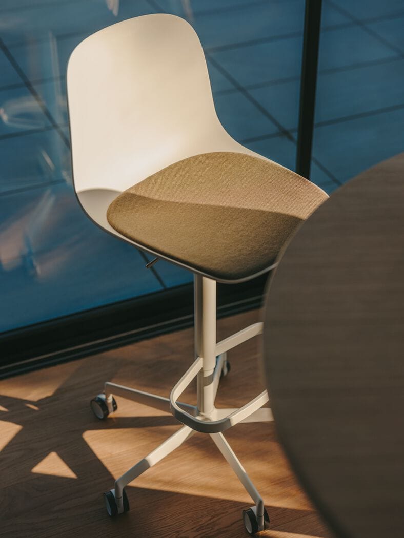 As a designer stool on castors, ideal for work environments and meeting rooms, this version of SEELA is much more than a plastic stool. Swivel and height-adjustable, it is available in customised colours and finishes.
