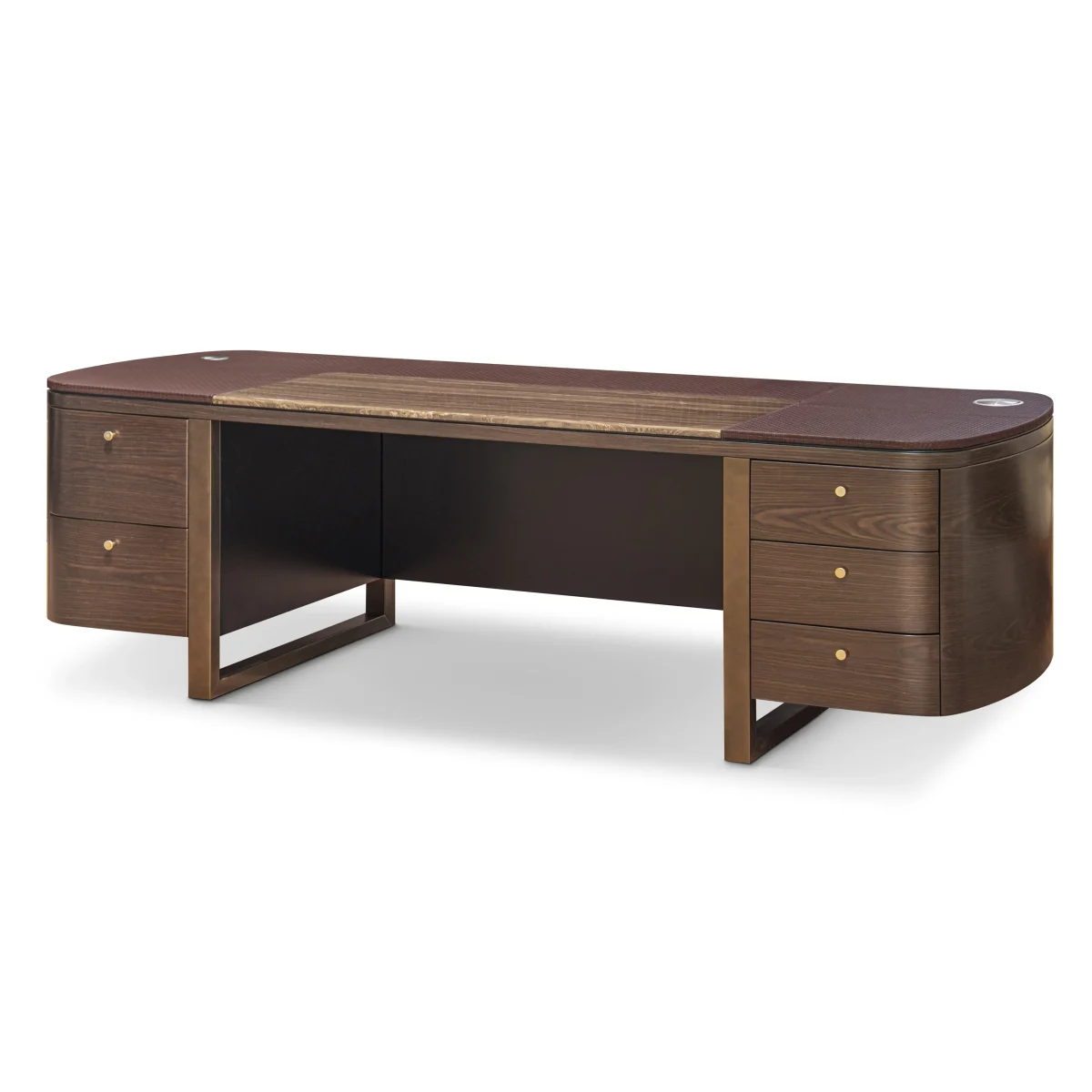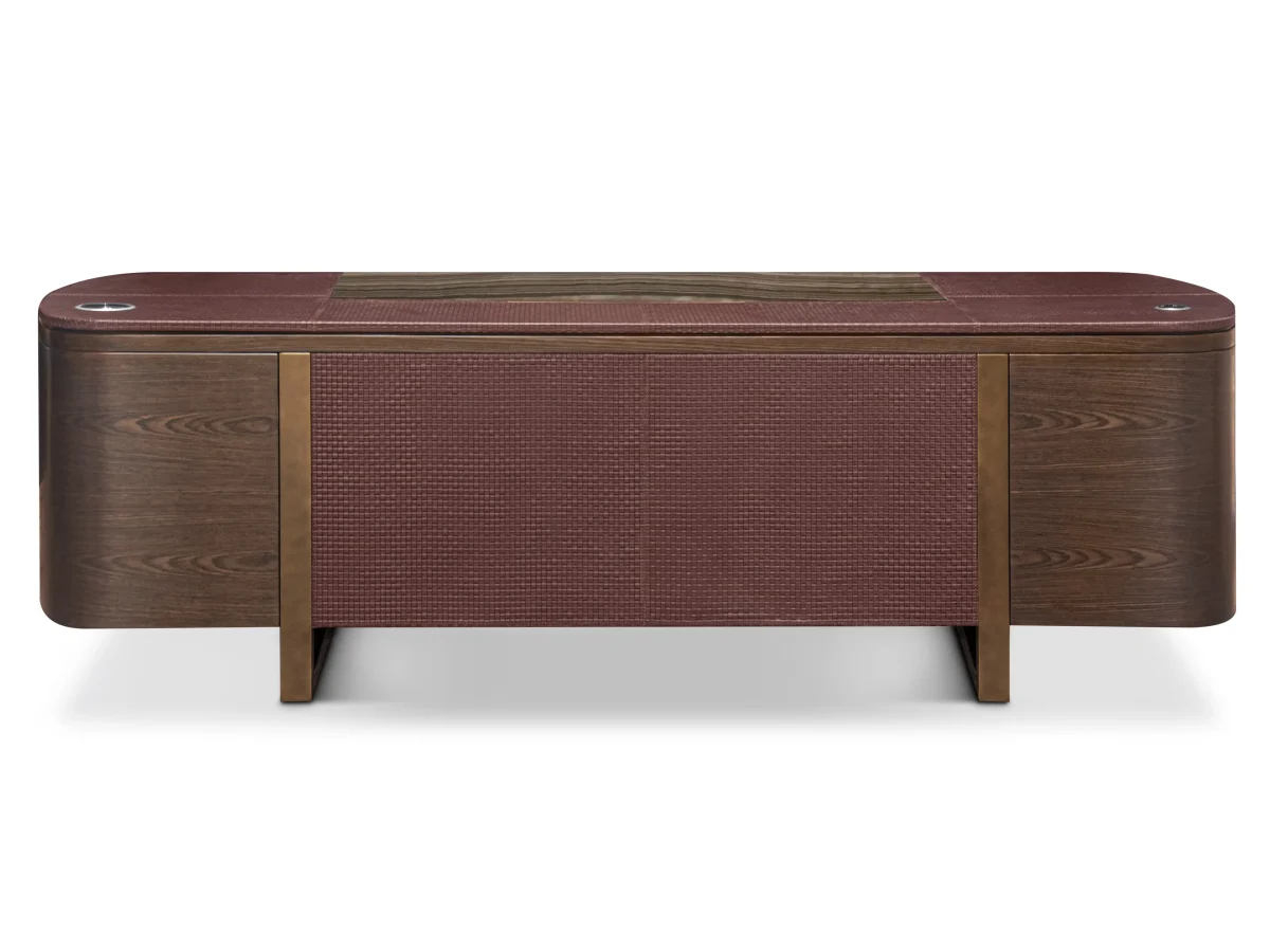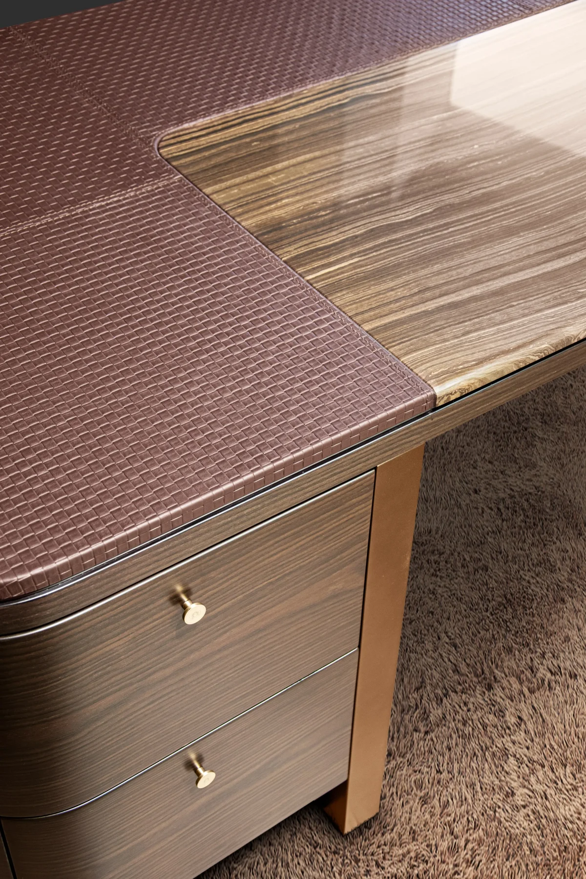 Seoul is a desk with top & frontal panel in leather Cuoio col. Dark Mocha with Small Tress print, Eramosa normal cut marble desk pad, sides & drawers in Xilo veneer col. Flamed Grey matt finish, metal details & base in bronze finish.