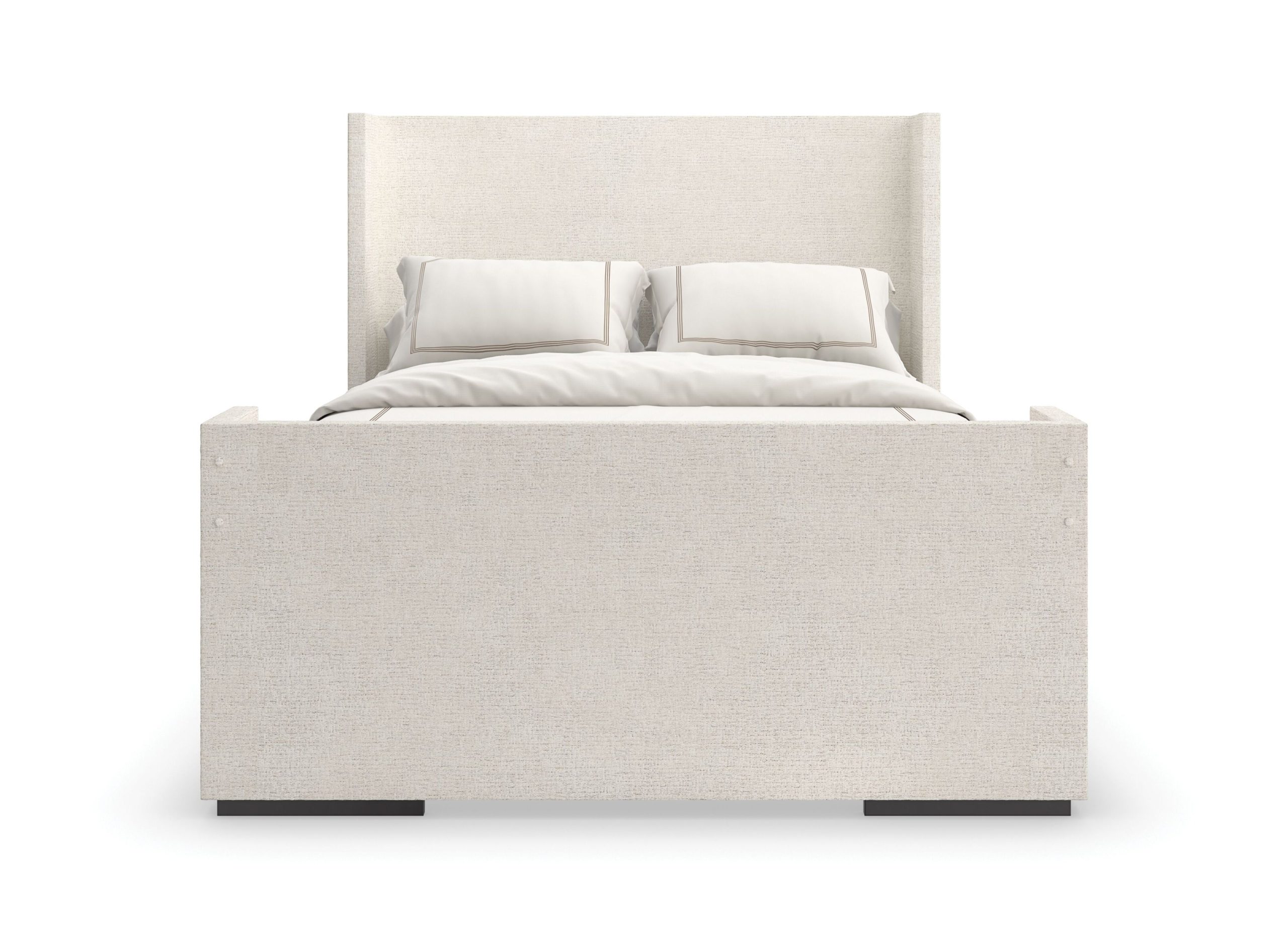 Dressed in a soft chenille fabric, shelter-style Shelter Me king bed brings an air of effortless elegance and enveloping comfort. Its simple, geometric form and soothing neutral hue blends beautifully with classic or modern design aesthetics. Features upholstered decorative buttons that cover brackets for fitting an optional, clean-lined canopy that adds a note of drama in an Almost Black finish.