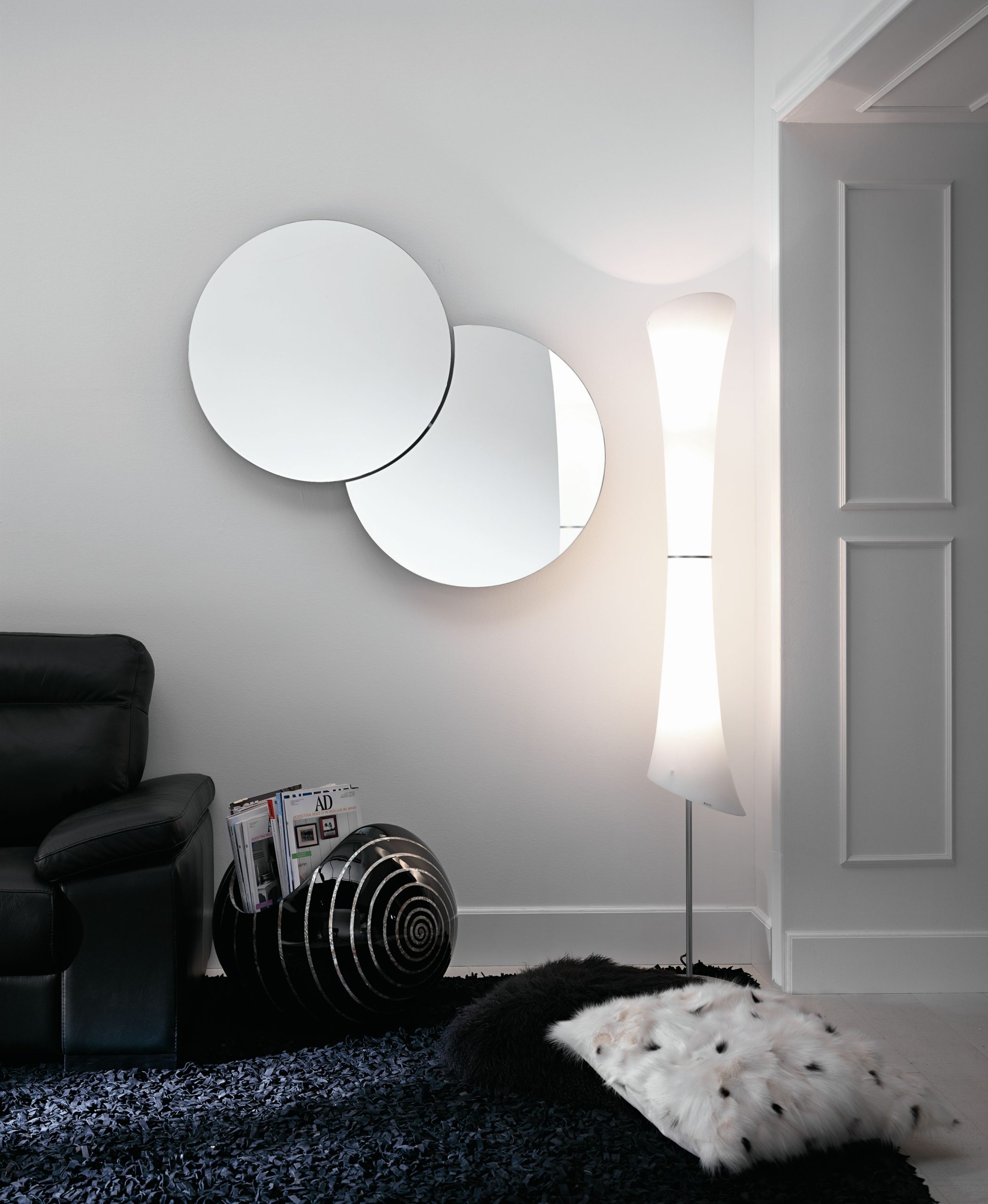 Mirror with fix central part and satellite that turns at 360°. Simple and unexpected. Size: 40 + 29 x h 40 cm 60 + 43 x h 60 cm 80 + 57 x h 80 cm Thickness: 4 mm