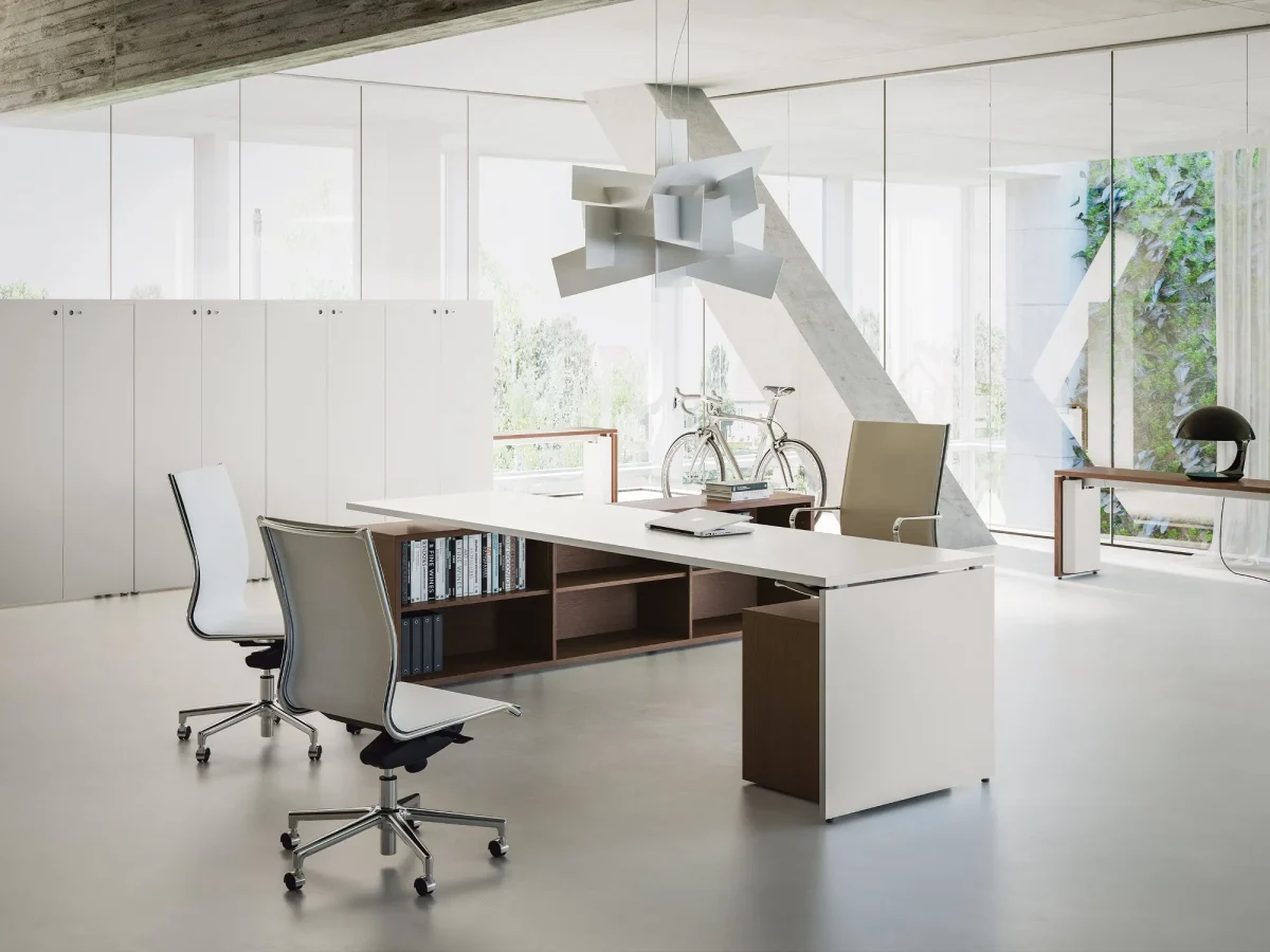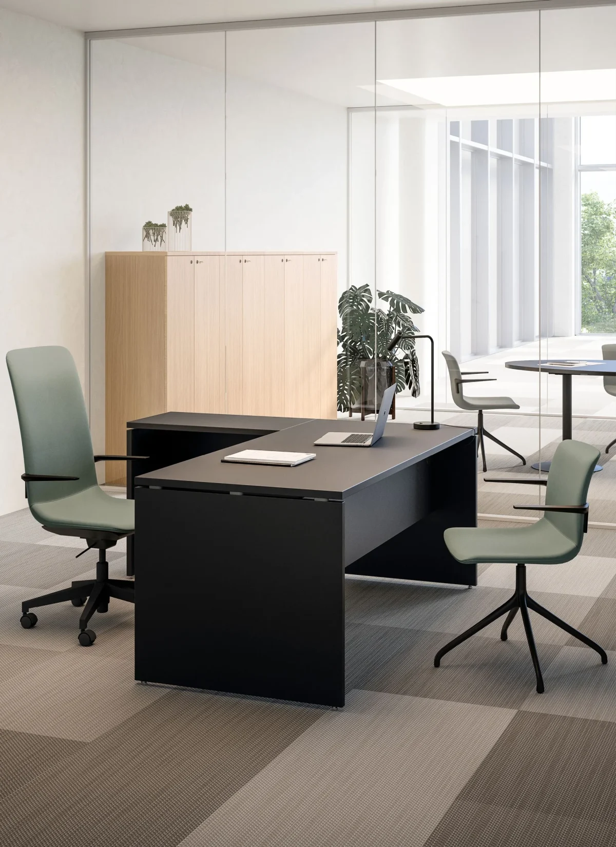 A flexible system. The system allows the creation of semi-executive configurations. The generously proportioned workstations thus become executive or meeting tables. Storage units can be open or fitted with wood, Nanofor or glass doors.