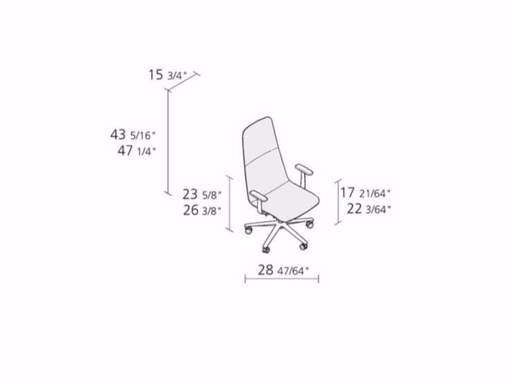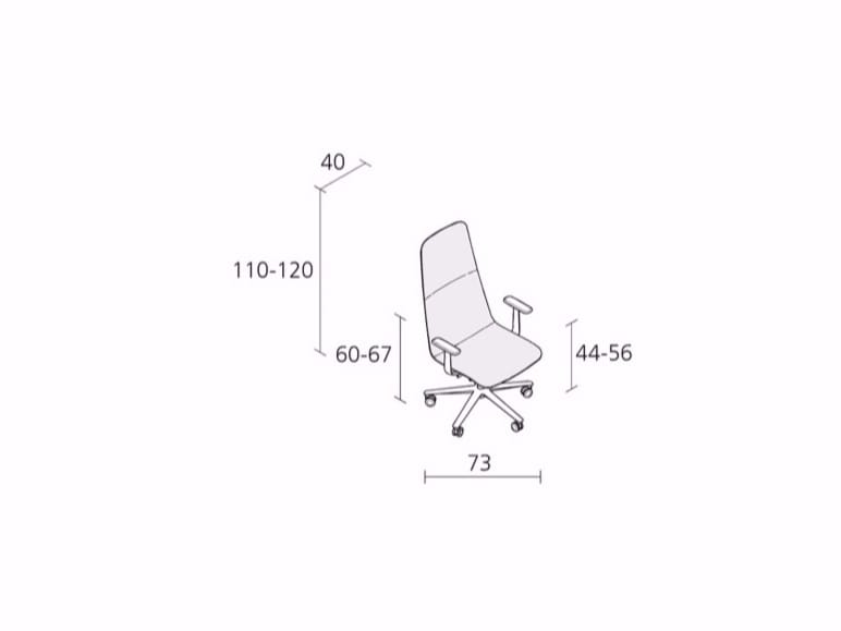 Chair with “t” shaped (or “y” shaped) arms with soft castors, height adjustable and 5-star swivel base with tilt mechanism (or fixed). Structure made of die cast aluminium stove enamelled, polished or chromed. Seat shellmade of printed polyurethane and metal frame, with back side made of plastic material, lacquered or covered with camira® or kvadrat® fabric or leather pelle frau®.