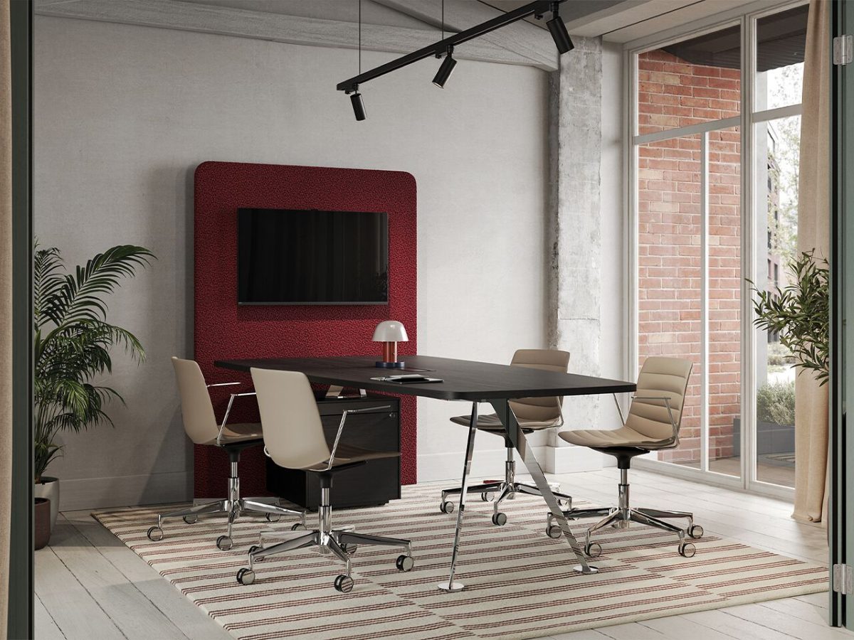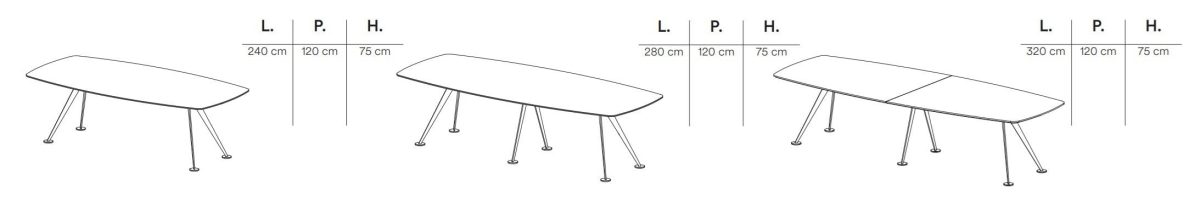 Spike meeting tables combine functionality and ergonomic comfort, satisfying the needs of the modern office. They are available in three lengths 240, 280 and 320 cm and can host up to 12 people. The tops are available in melamine, veneer and glass to match the polished chrome or embossed white or black painted frame. All tables can be equipped with hidden access tops that allow all users to connect with their laptops while maintaining the clean design of the tabletop.