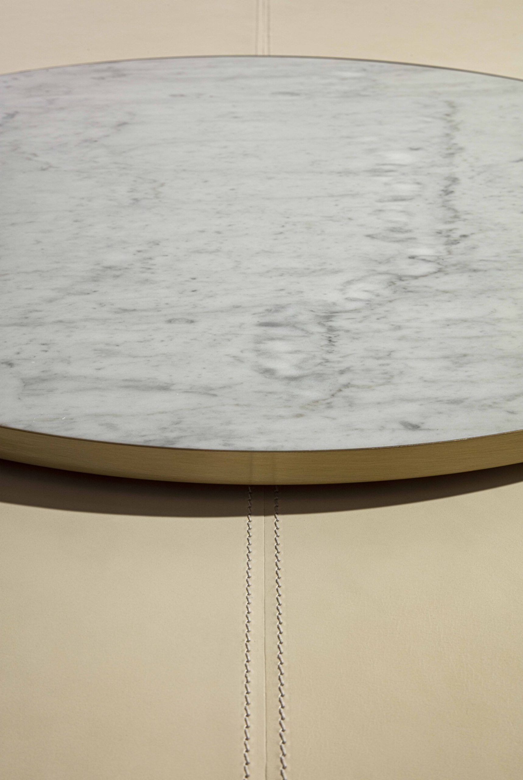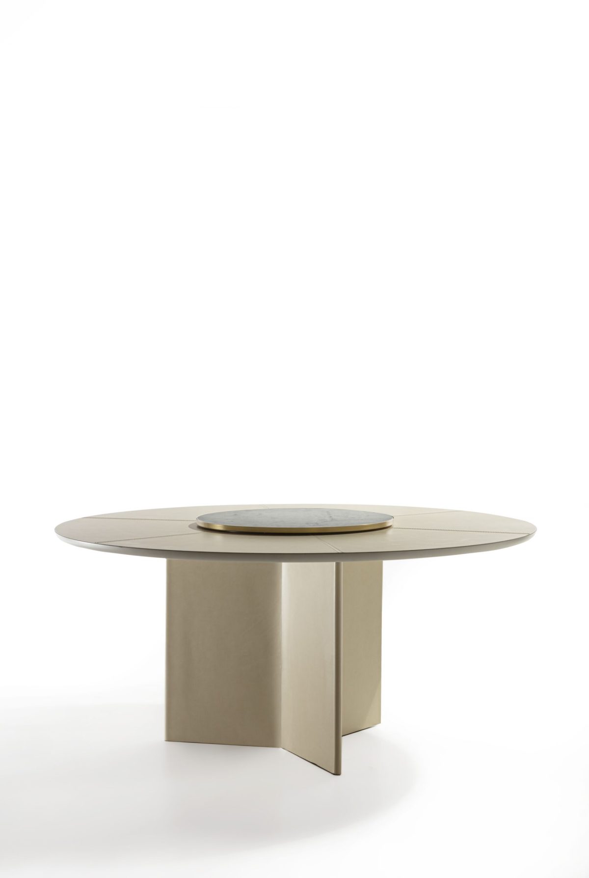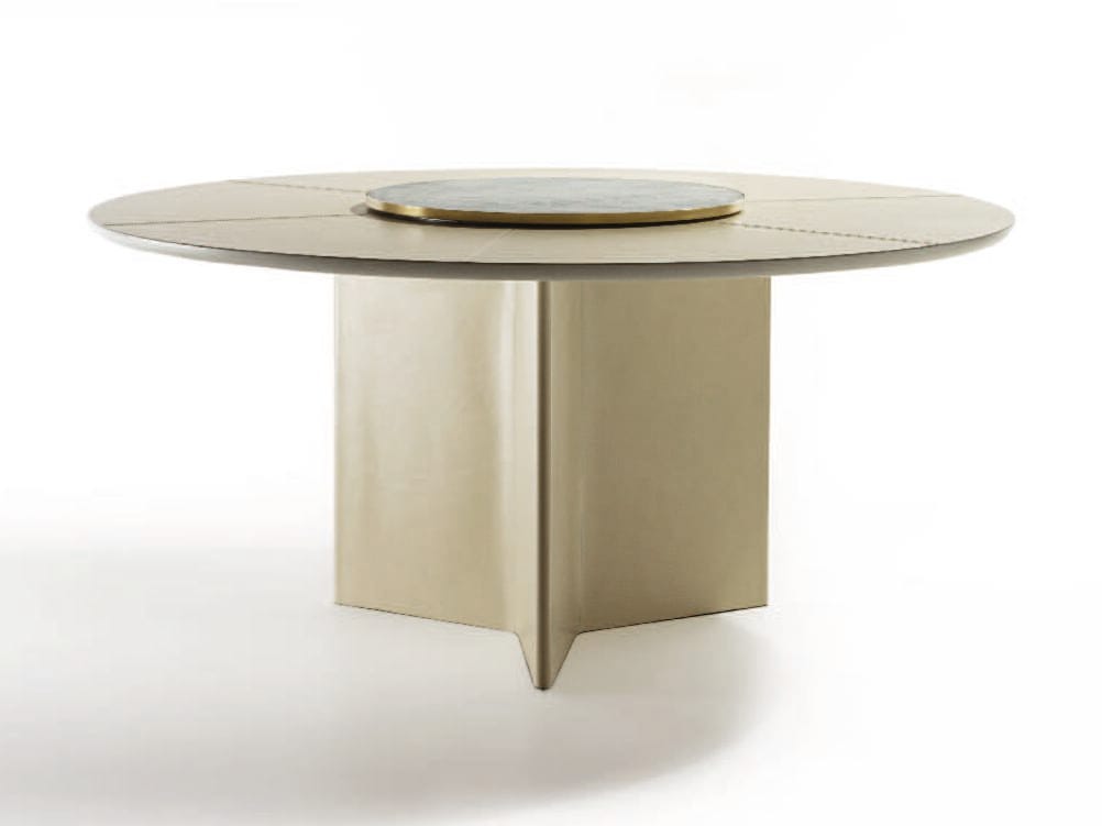 Star is a table with central wooden base covered in leather, top in glass or covered in leather with a lazy susan, a swivel marble top in the center of the leather one.