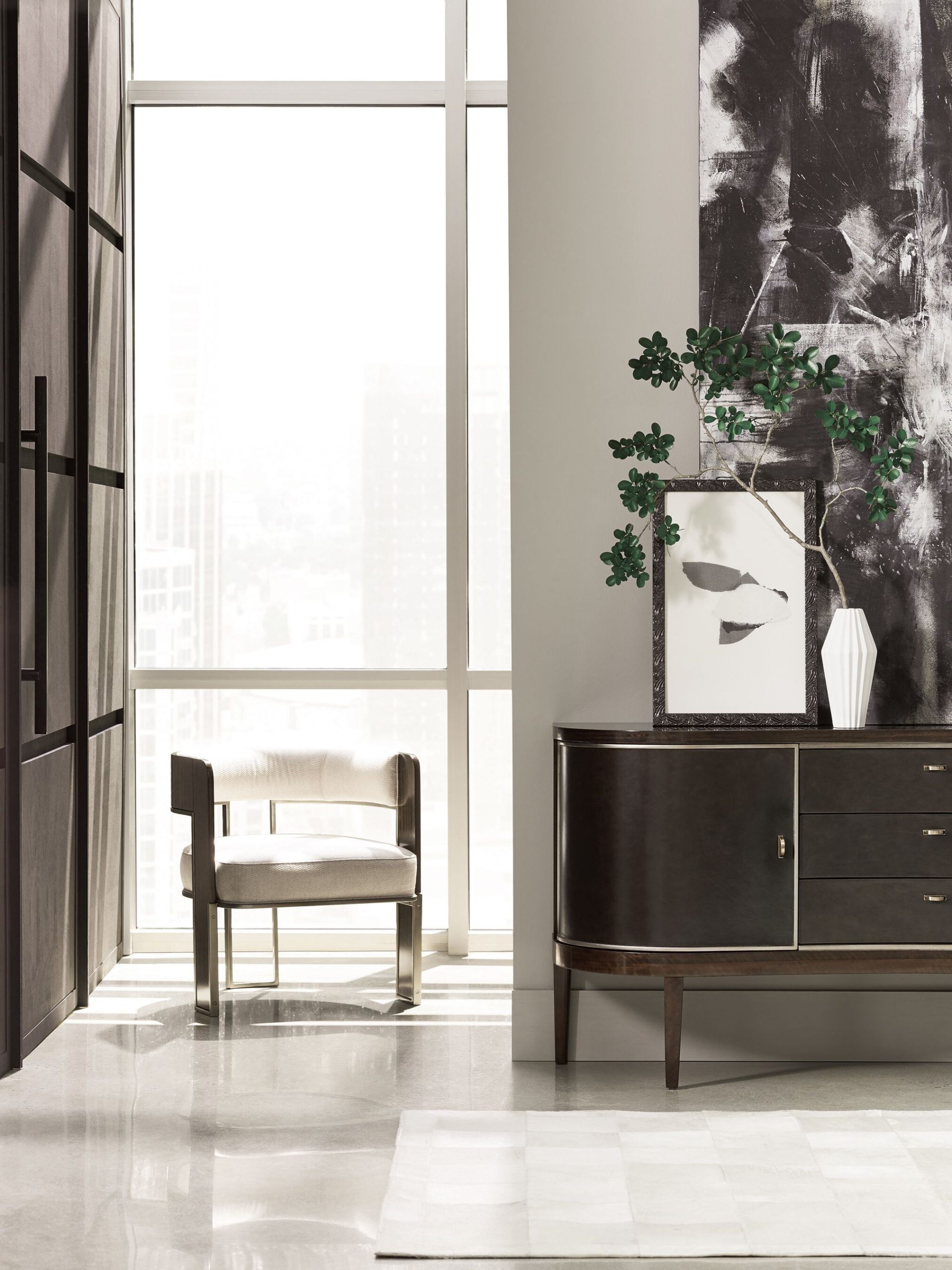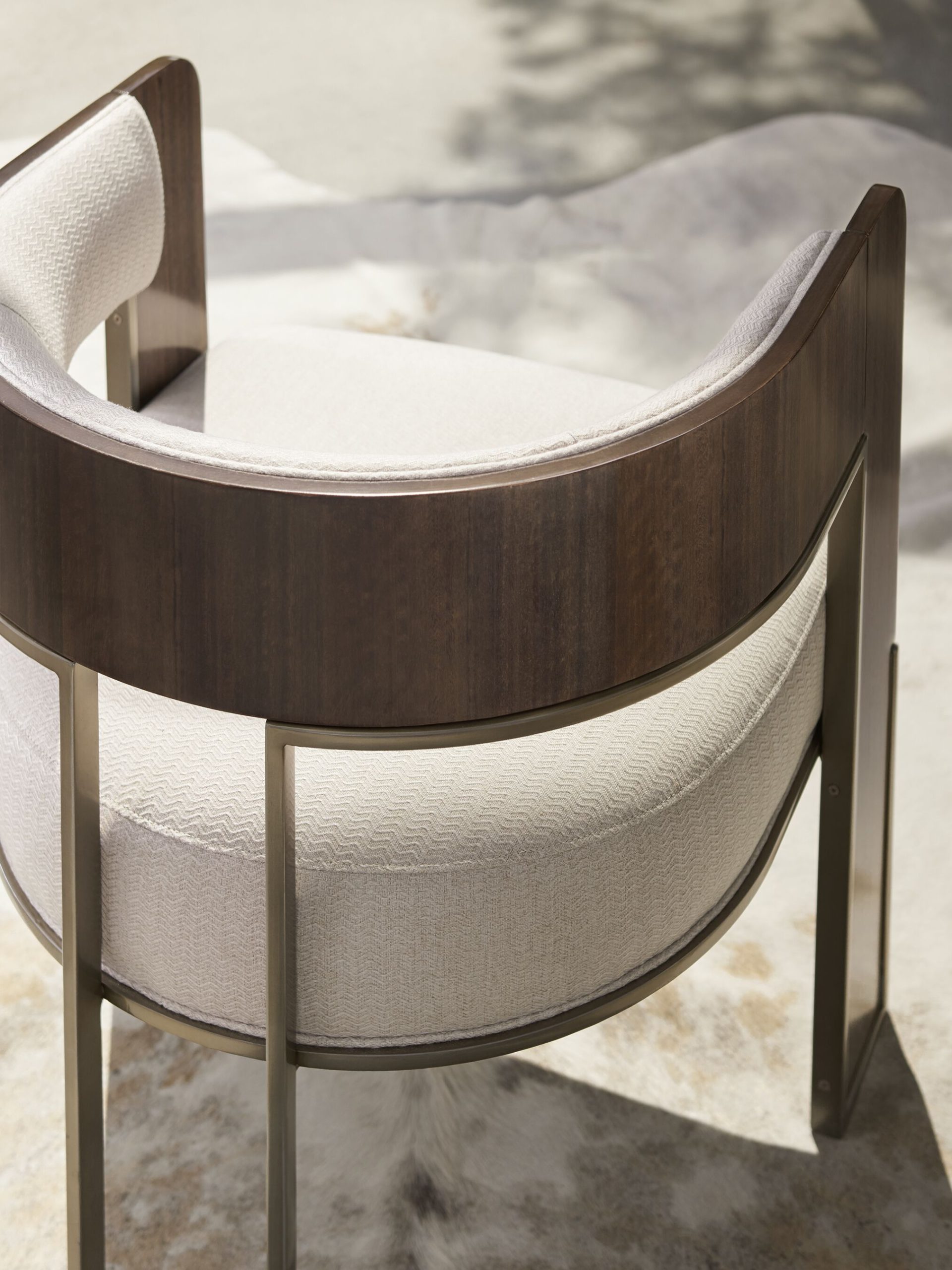Streamliner open barrel-back chair is on the right track to becoming a future classic. The chair is suspended inside a half-moon-shaped frame of fumed figured eucalyptus wood, finished to a high sheen in Aged Bourbon. Thin Smoked Bronze metal legs support the back center of the chair and add style and stability. The inside back and tight seat are comfortably upholstered in a light cream vertical chevron fabric.