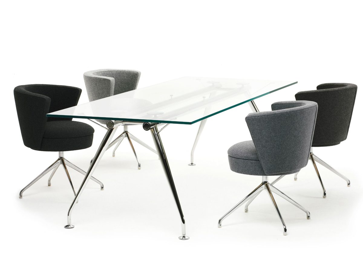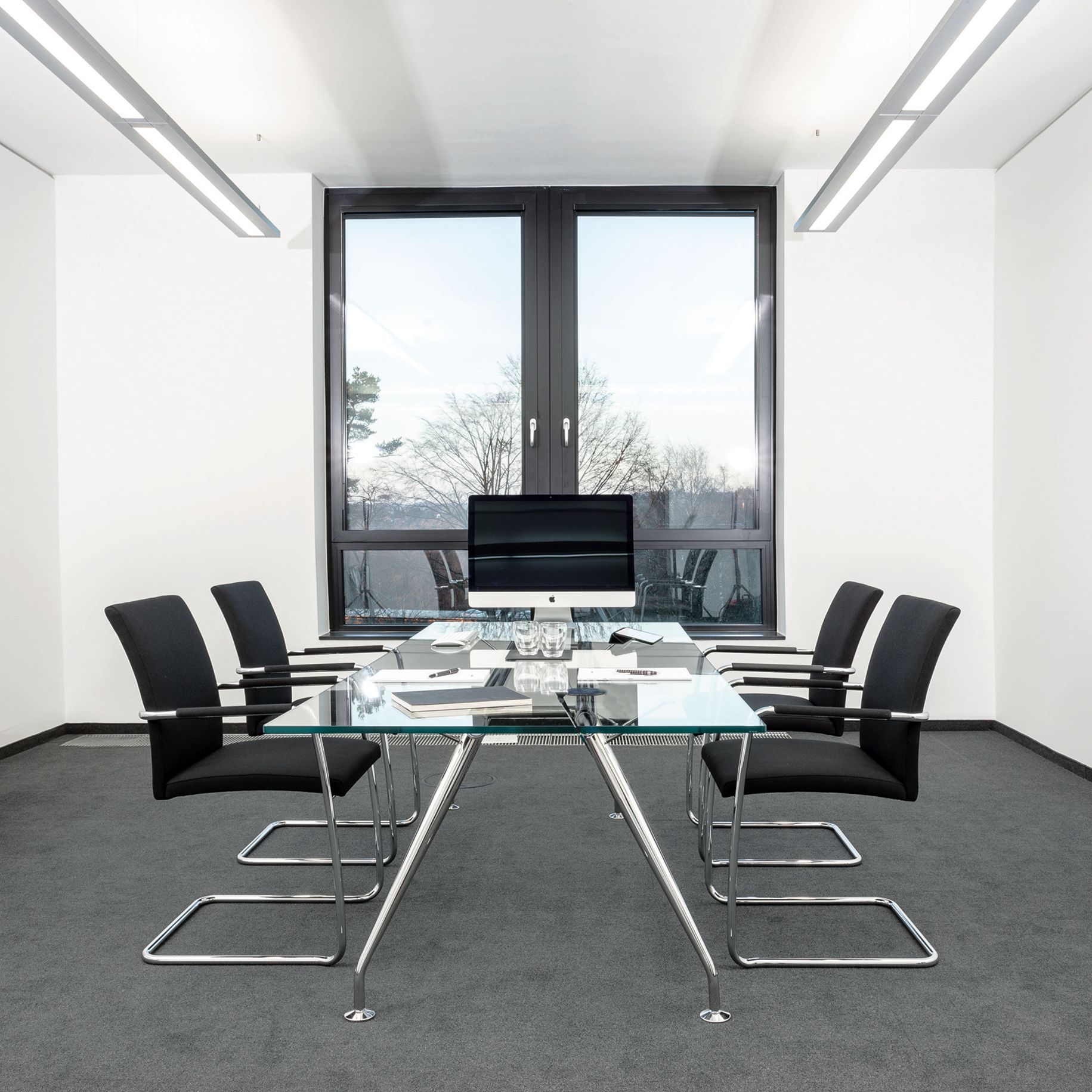 .sun is the collection of meeting tables. Due to the numerous possibilities, this particular design idea creates a whole system with many advantages. The table has several modifications. The connecting link is the elegant, chrome-plated steel structure, which also comes from the top with a glazed tabletop to expression. Desks are available with and without sideboard, and small conference solutions. The emerging, slender foot elements create the floating nature of sun.