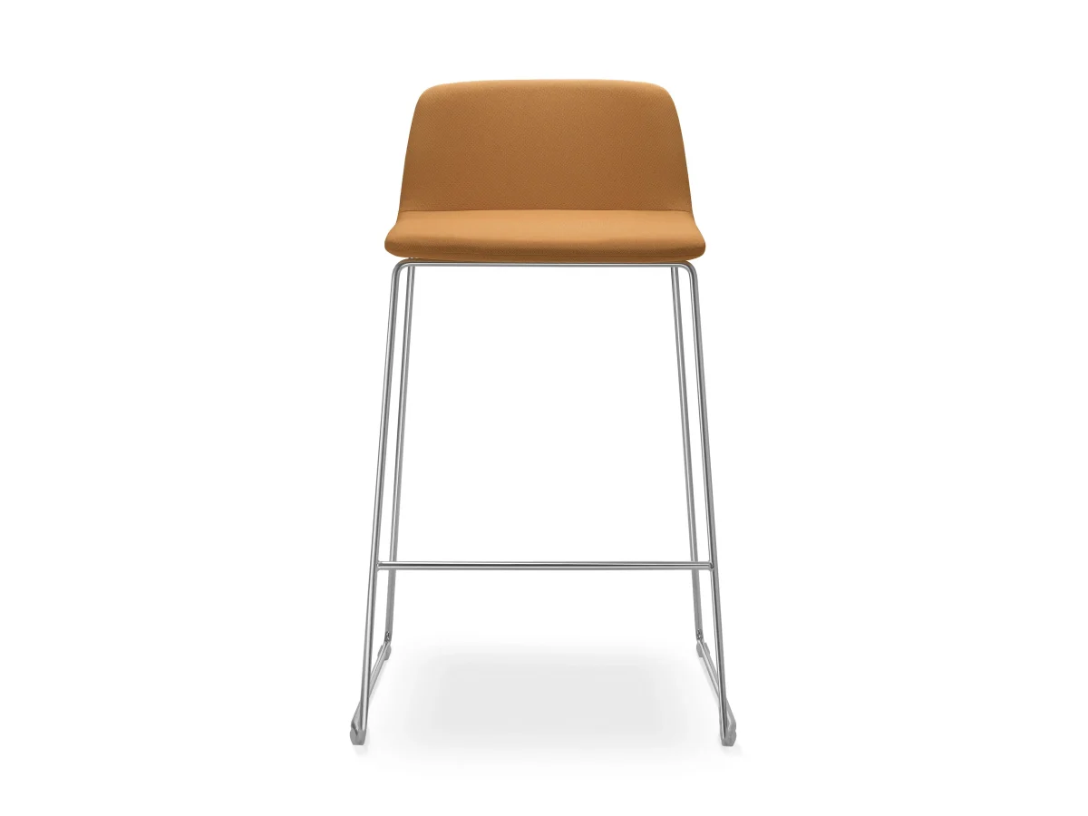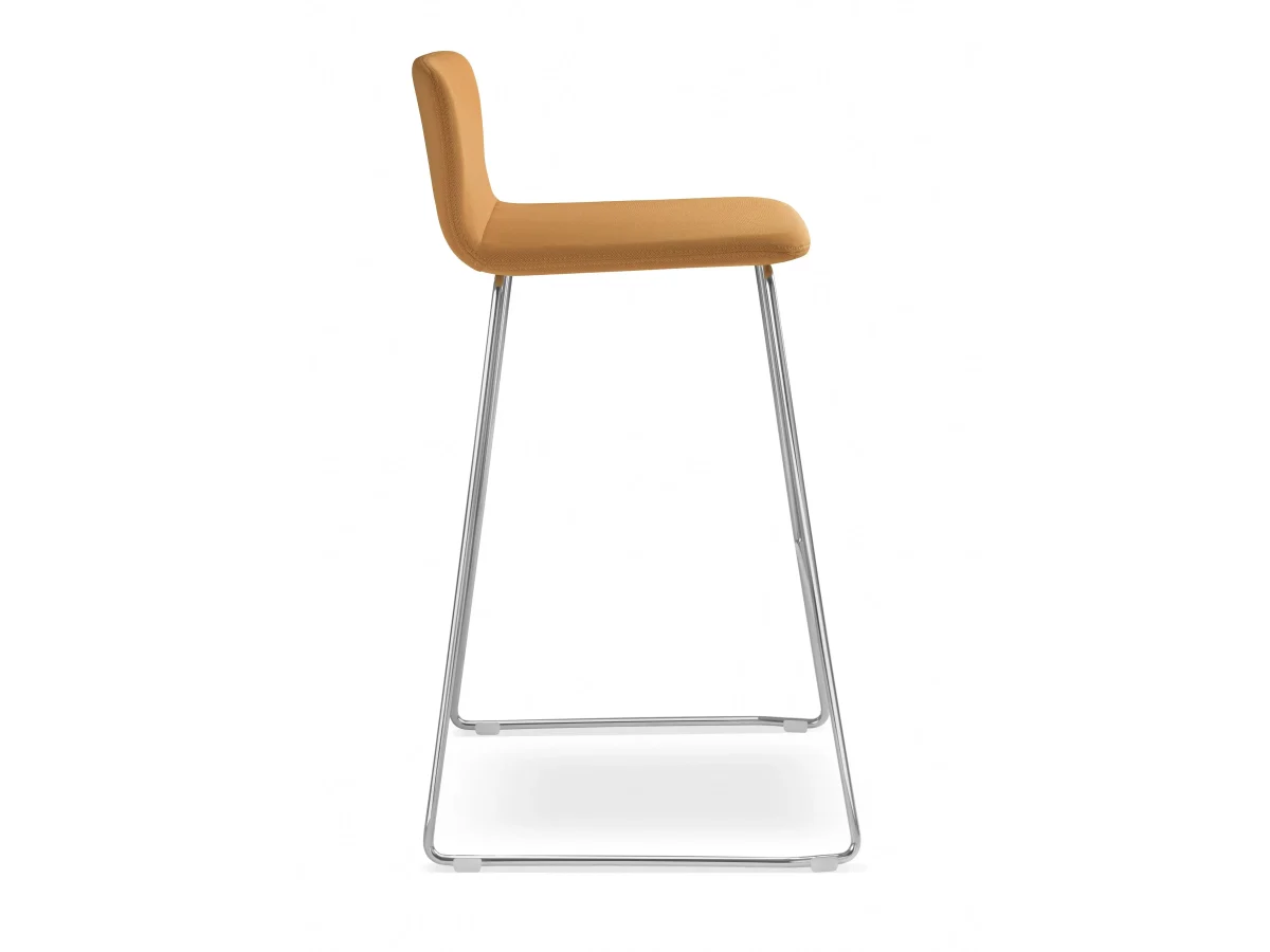 SUNRISE 153-Q-650-N4 is a barstool with fully upholstered shell, low backrest, seat height 640 mm, without armrests, steel wire chrome plated base, plastic gliders.