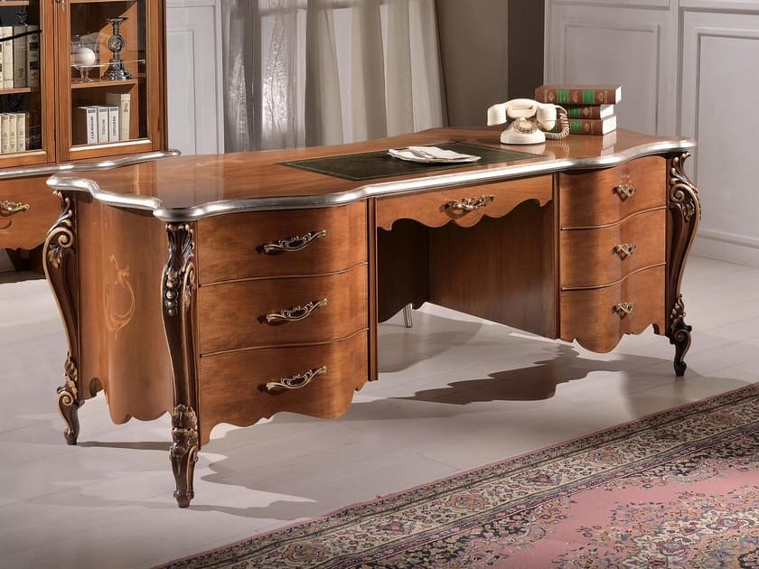 Sveva is an office writing desk in solid wood walnut lacquered with details in gold leaf.