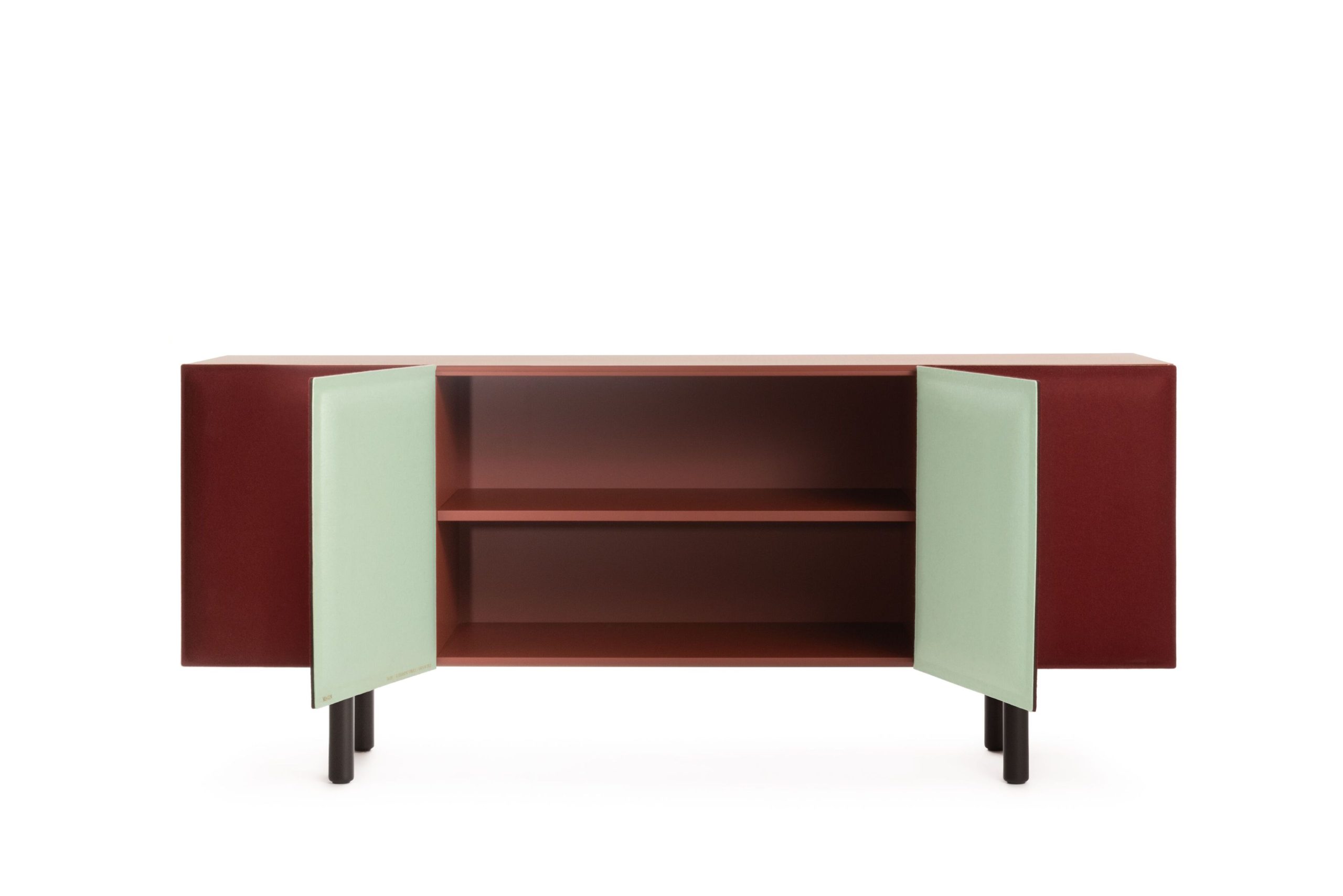 Materials: frame (sides, back and shelves) in painted MDF, doors in felt, feet in anodized aluminium.