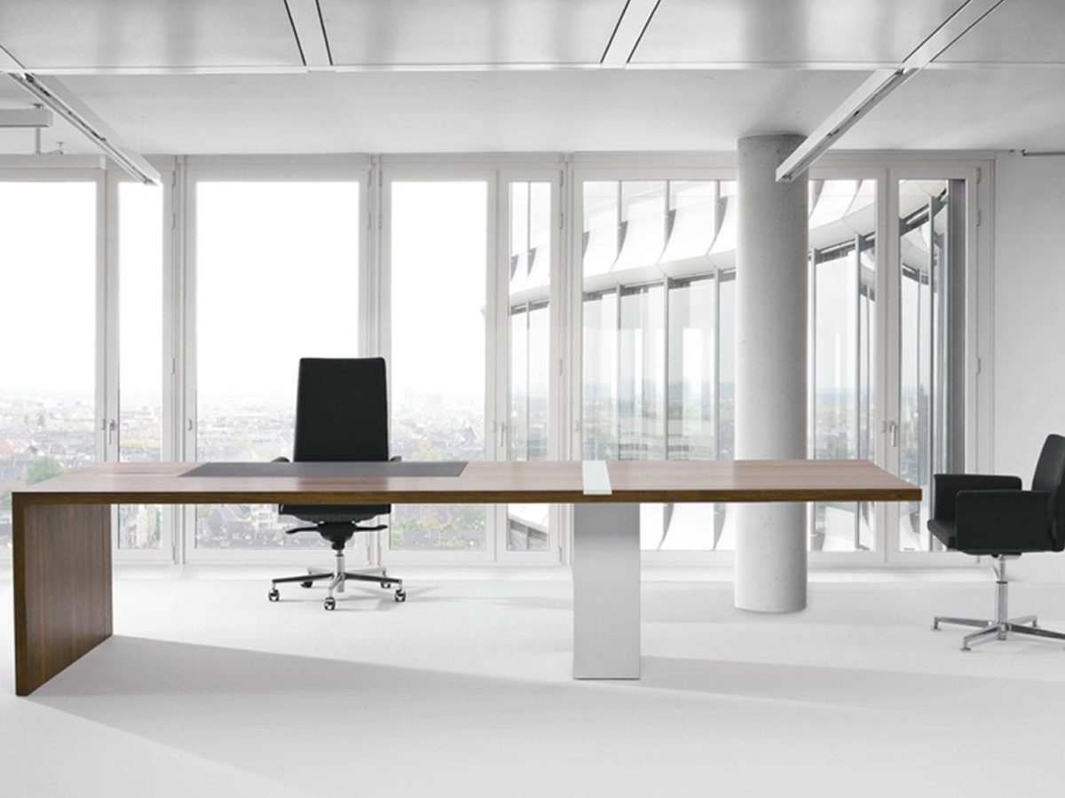 For a quick occasional meeting, the table offers with the visually separated conference section an elegant solution. The generous desk series was developed to complement the .taros management program. The leather lining is flush-fitted and the size is adapted to the XL desk.