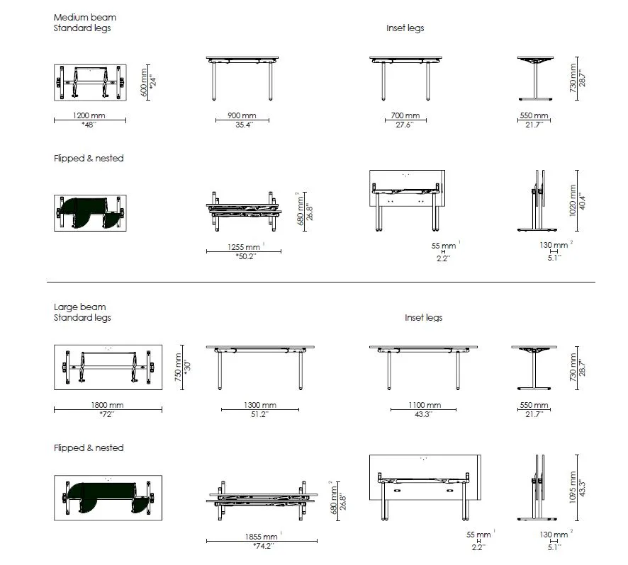 Endless permutations of size, shape and finish can be linked together to create numerous different configurations. The Tempest system will therefore always have an answer to architects specification requirements. With Tempest, reconfiguration has never been easier discreetly concealed castors fixed to one end provide easy wheel-barrowing of the tables around the space. By flipping the tops, the tables can be nested, which saves valuable space when not in use. Flipped tables have a nesting depth of 130 mm / 5.1. Flip the tops and nest the tables inside each other tops against tops. 6 tables can be stacked on table transporter.