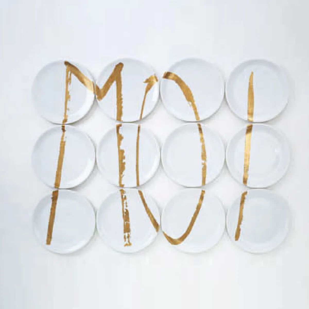 White meets gold. Giandomenico Sozzi graphic sing strongly decorates the white plates designed by Antonia Astori.