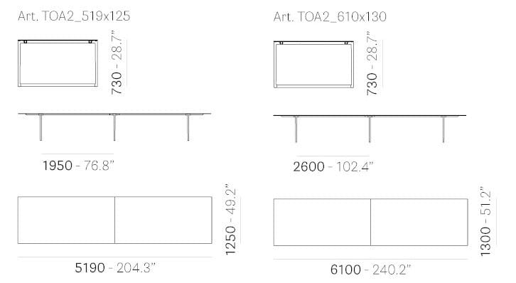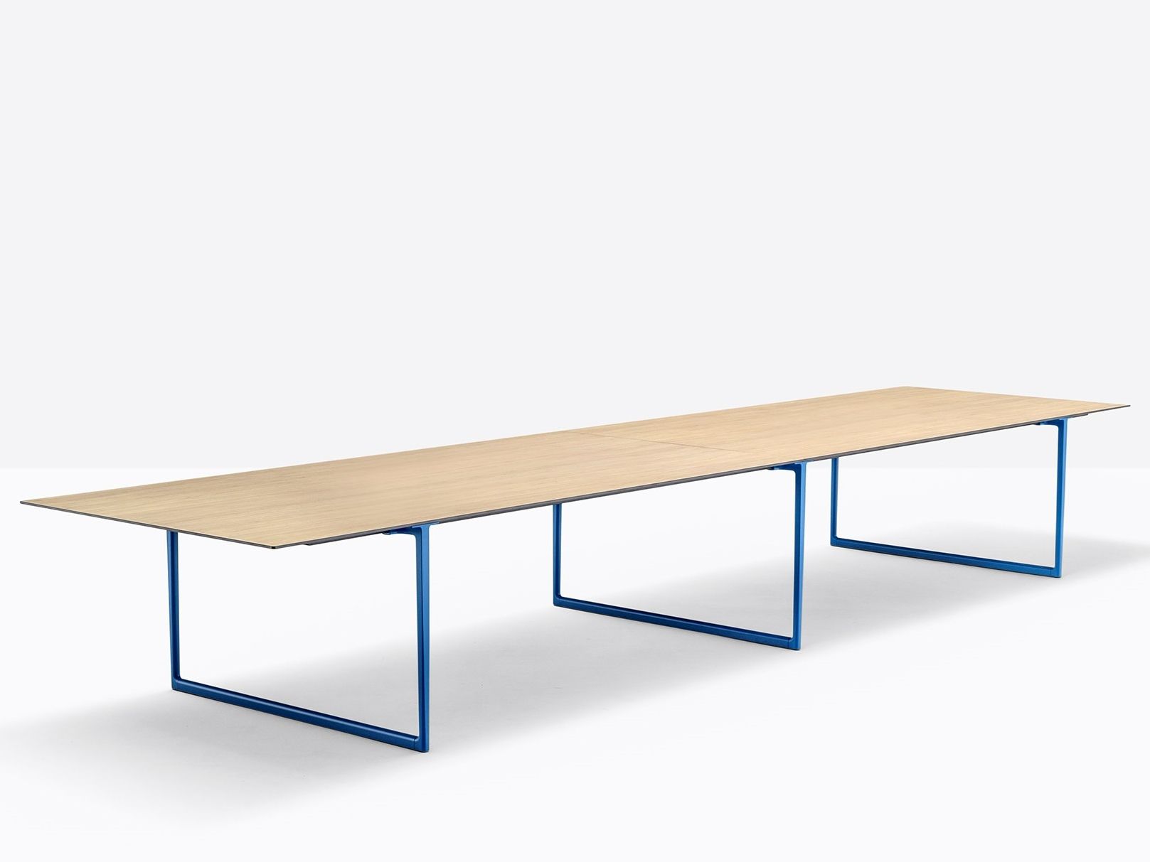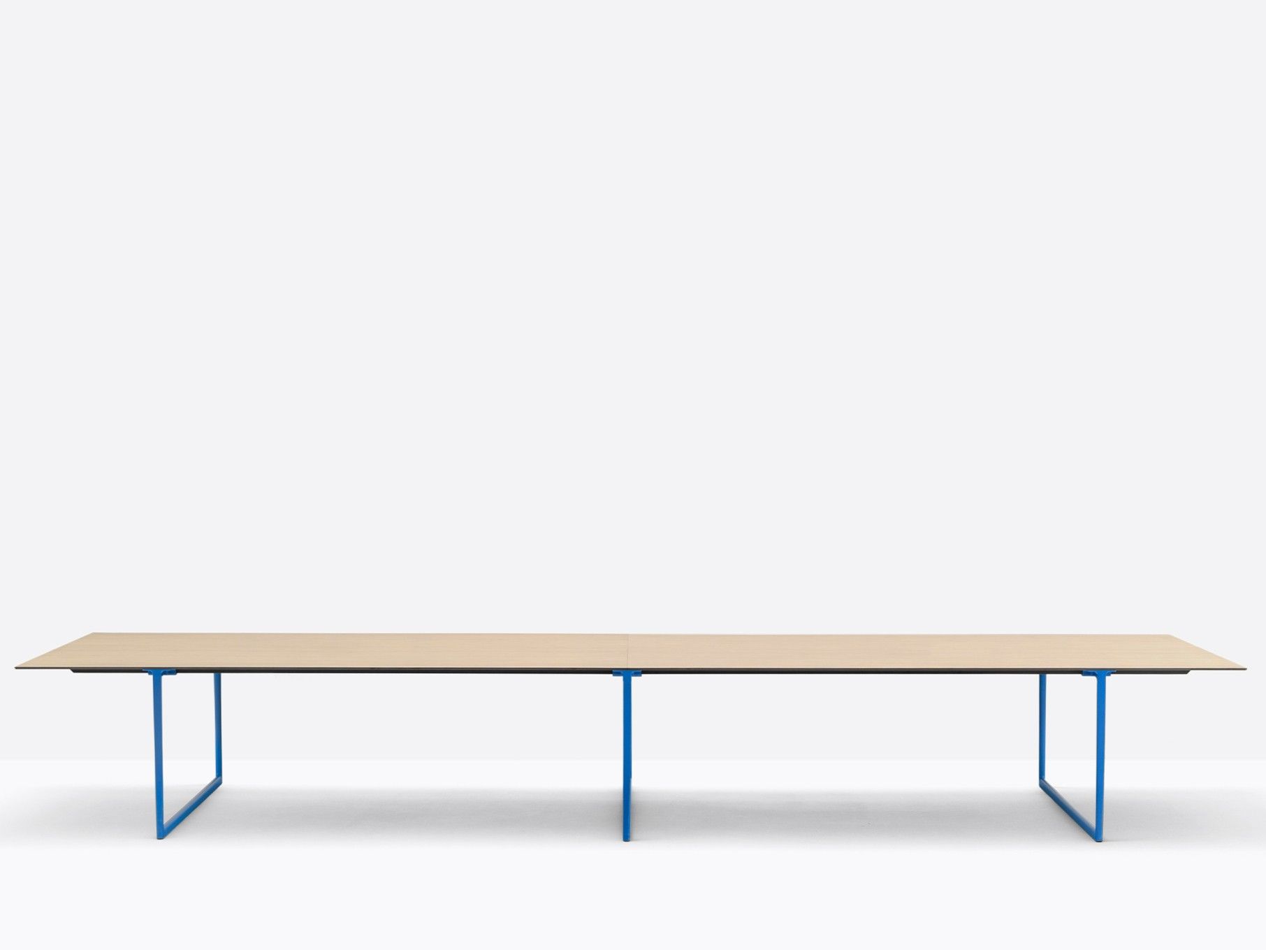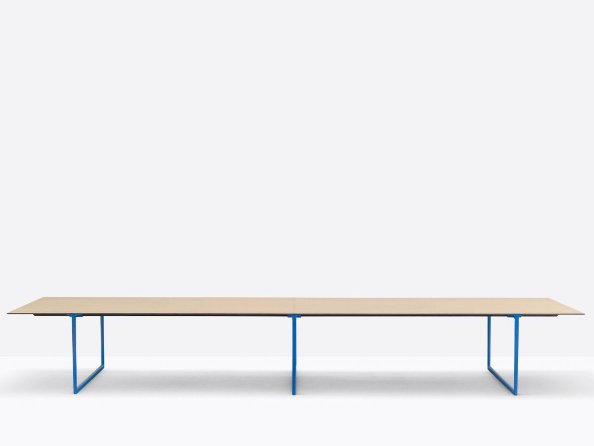 Toa is available in a variety of widths and depths and in a wide range of finishes.The Toa table combines a technical-industrial style with decorative allure, giving life to a functional and evocative product. Lightweight and minimalist, it is characterised by a solid die-cast aluminium frame. The main features are its tapered bridge legs made of die-cast aluminium, which are thinner at the base and widen up towards the T element that supports the top. Toa tables endless modularity in length and width is the perfect choice for work spaces. In the largest version with three bridge legs, it serves as an efficient conference table in large board rooms.