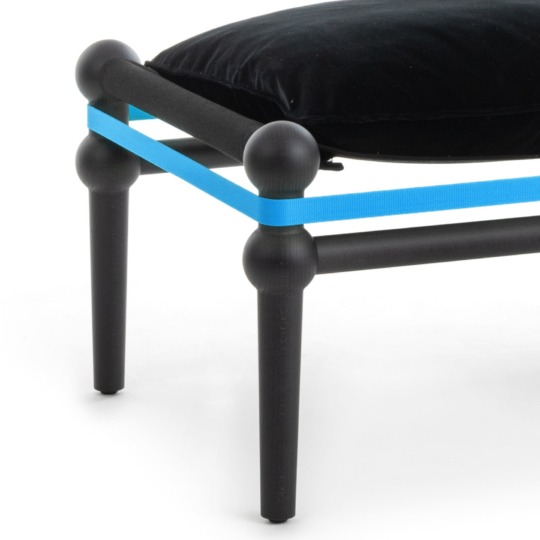 Ottoman. Material: Frame in solid beech, stained natural or aniline dyed black. Seat in self-bearing fabric and cushion cover in removable fabric. Tension belt in polyamide. Felt pads included.