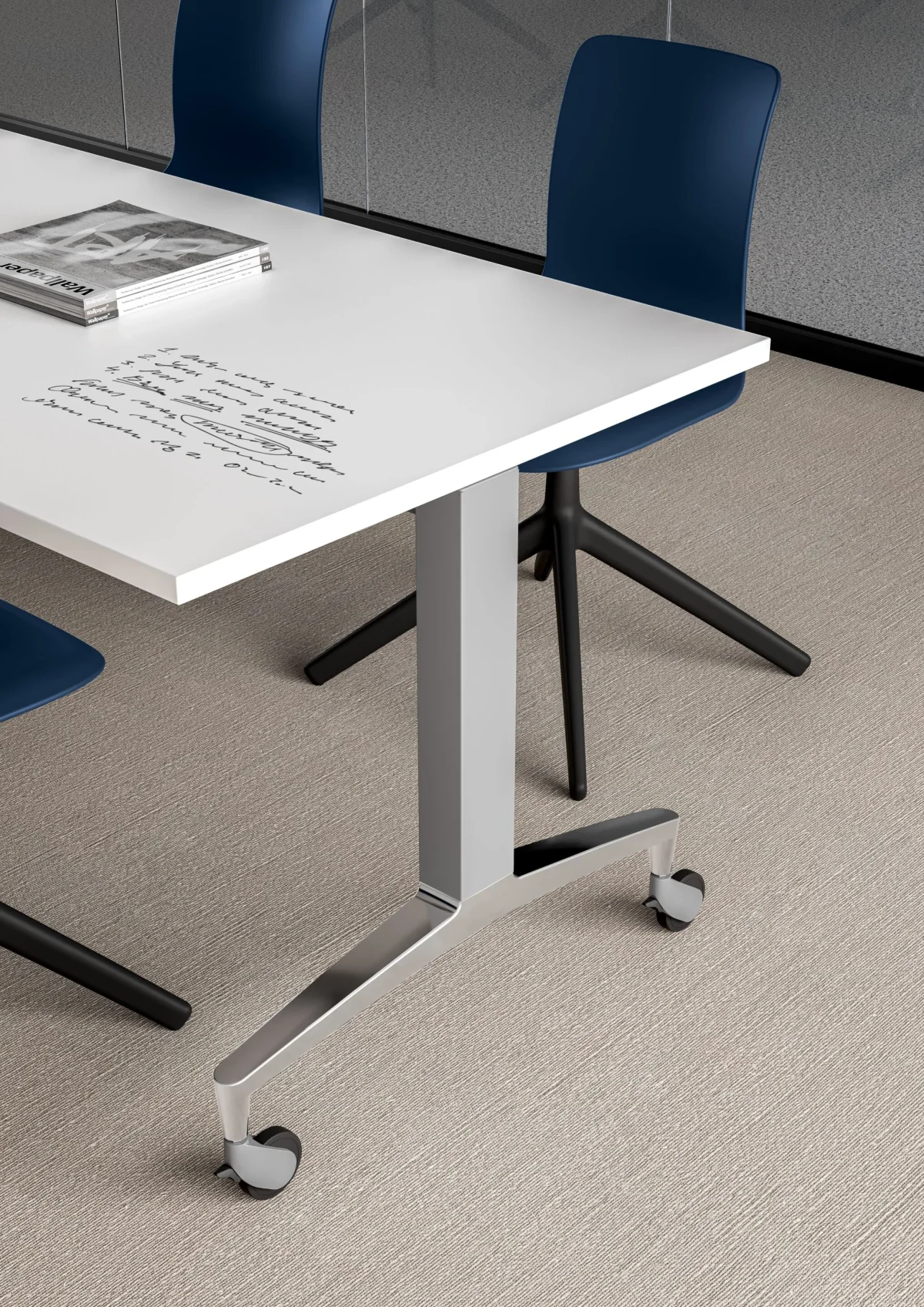 Ulisses AR is the rectangular table designed by IBEBI that combines refined design and multifunctionality. Fitted with a flip-worktop and castors, Ulisses AR is designed to be moved easily so that the work space can be reconfigured quickly. This flexibility makes the Ulisses table particularly suitable for furnishing all settings where dynamic space management is needed, such as meeting and conference rooms, environments dedicated to events, classrooms and teaching spaces. But thanks to its elegant design, Ulisses is also perfect for executive and presidential offices, where it brings, at the same time, prestige and versatility. The polished or painted die-cast aluminium foot and the numerous finishes available for the legs and top, make Ulisses the perfect interpreter of different styles, from the most classic to the most modern. The rectangular top of this Ulisses model is available in different lengths and depths.