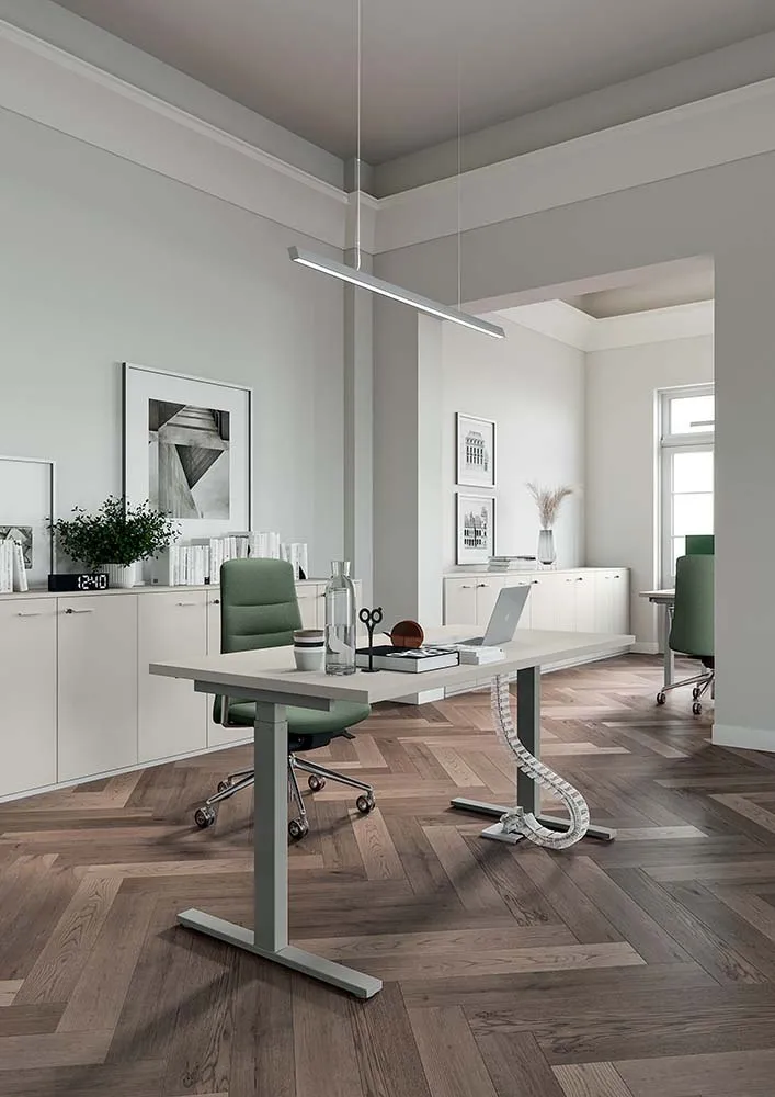 The control with up&down system for table adjustment is built into the design of the desk, impeccably combining aesthetics and innovation and providing superior postural well-being in one small gesture.