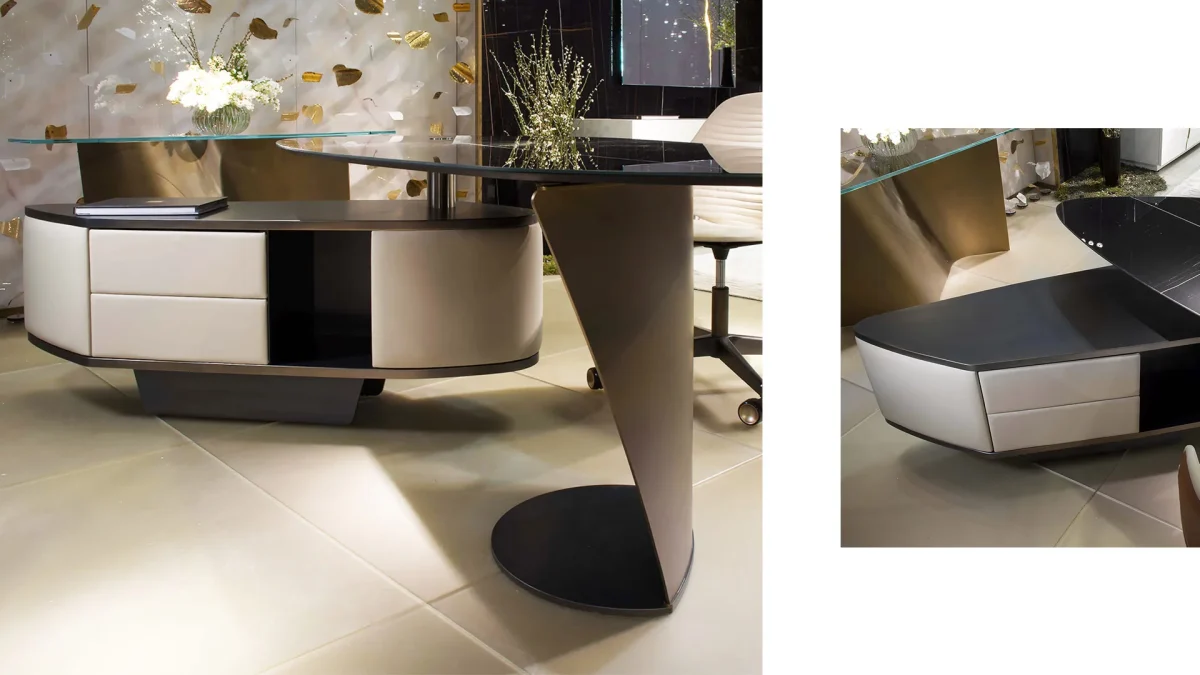 Desk with metal base in Bronze (100M) finish. Shaped top in Marble glass 12+4mm th. with cable-hole. Adjustable unit with 2 drawers with structure in Bronze (100M) finish and sides covered with leather. Base and unit in Bronze (100M) ,brass (104M), dark brass (105M), titanium (101M) finish. Cover in leather CAT.C, COLORATA, NABUK, NATURALE.