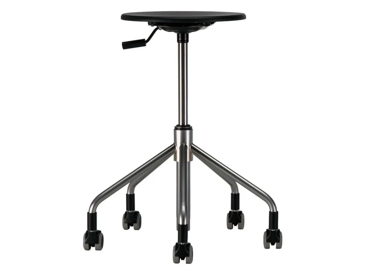 Vertigo LV06 is a swivel stool with a steel tube structure in chrome or mat chrome or aluminum painted finish. Beech-wood seat in natural finish or lacquered, adjustable height, with or without wheels. Optional: upholstered seat in fabric.