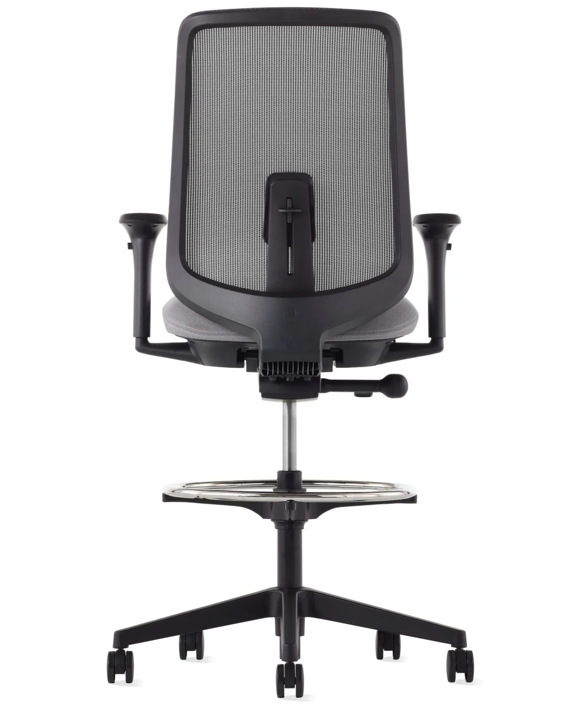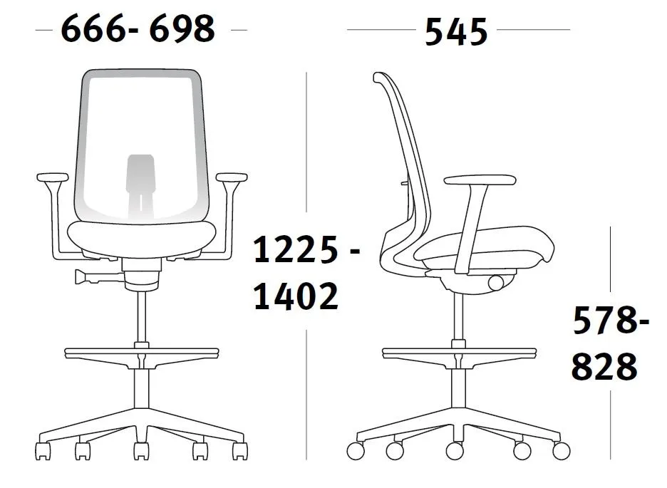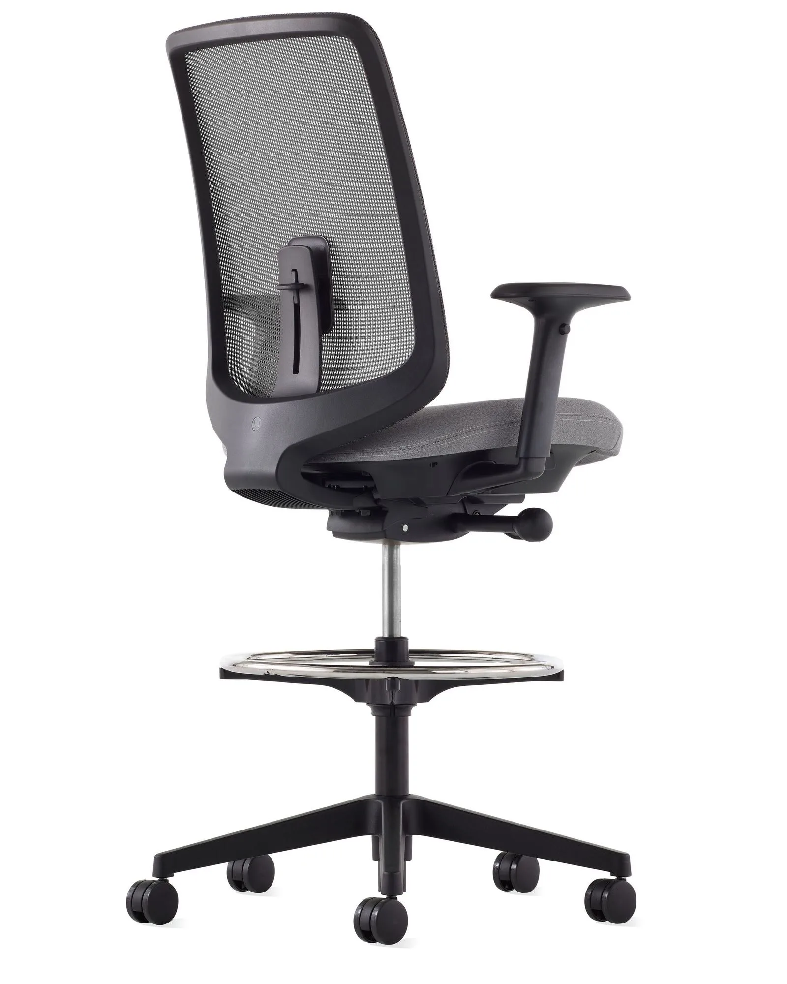 Verus is a five-spoke office stool with mesh backrest. The swivel stool is height-adjustable and is equipped with armrests and footrest.