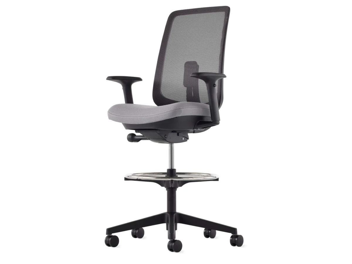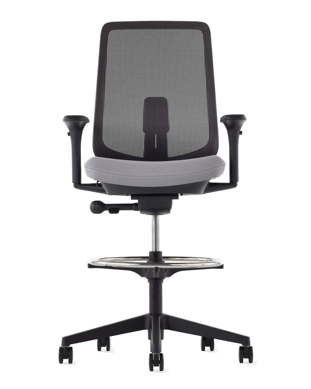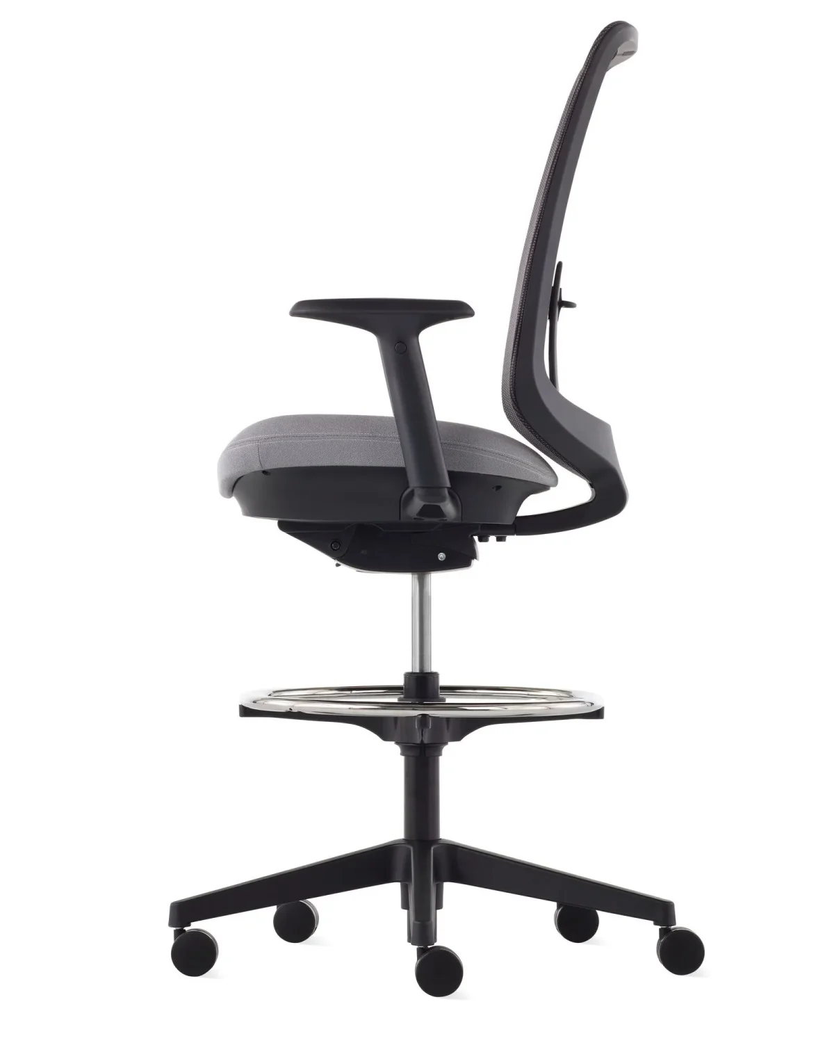 Verus is a five-spoke office stool with mesh backrest. The swivel stool is height-adjustable and is equipped with armrests and footrest.