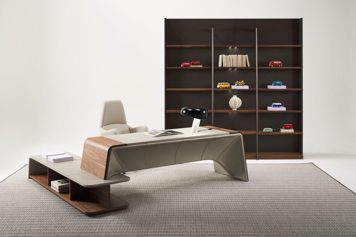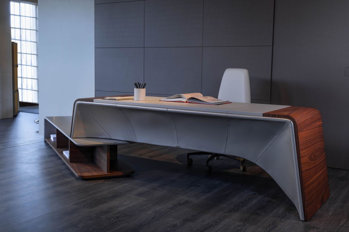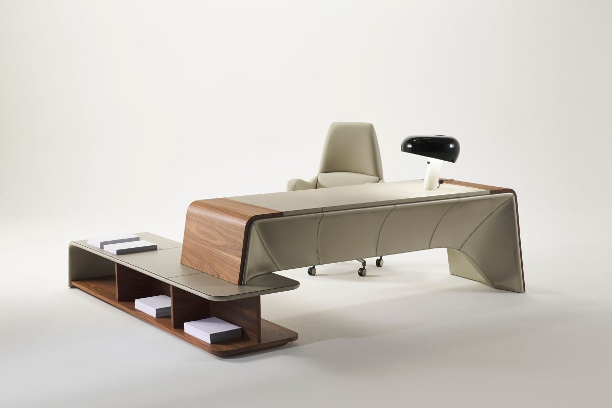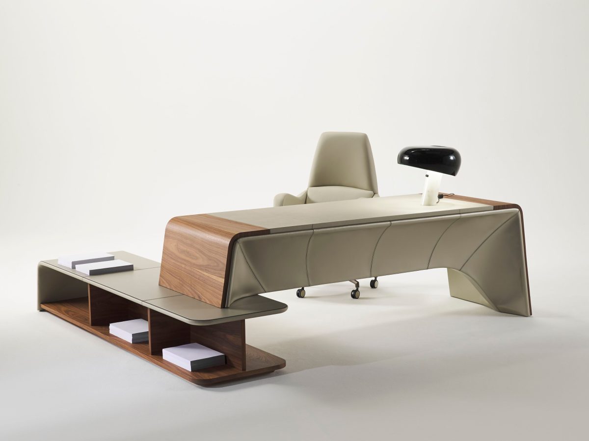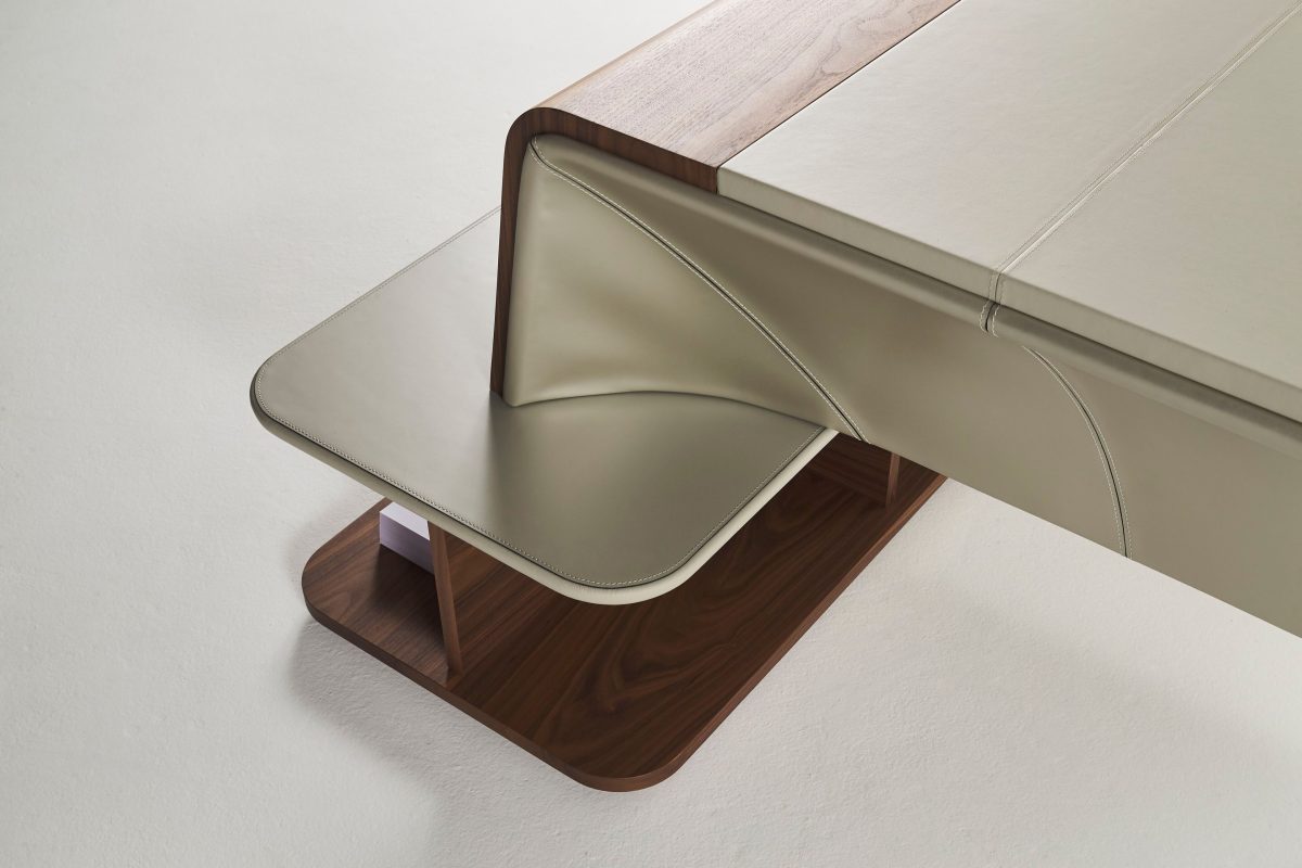 Victor is an executive desk for offices, the result of the fusion of the Victor desk with the Victoria sideboard. The two elements are composed in a single structure whose angular width can be adjusted according to the customers taste. The supporting structure in plywood is covered with cuoietto.