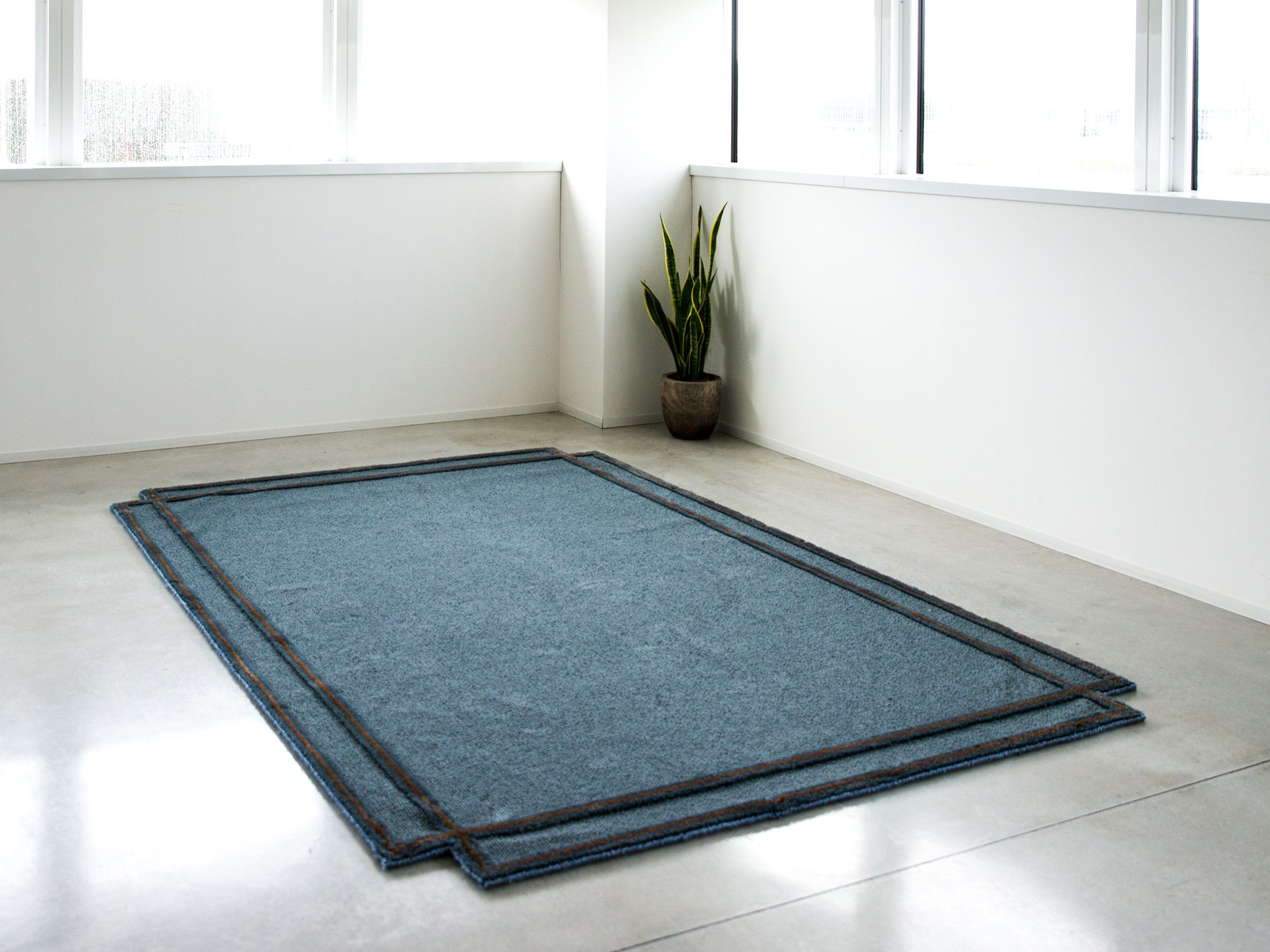 The Volentieri project came into being after visiting, with Eugenio Perazza, a familyrun Venice firm which has invented its own technique for producing tufted rugs on an industrial scale. With them, I wanted to make simple, quiet and almost neutral rugs, lit up by slim, bright and luminous bands like neon strips. Volentieri is a collection of rugs available in standard sizes and which can also be made to measure. There are two models: Cornice, which appears as an overlapping of two rugs, one on the other, and Finestra, which appears instead as three overlapping rugs. This creates a very characteristic shape yet one which is easy to use. In each of them we find a group of weaves and yarns of a different type: weaving both in velvet and bouclé and shiny viscose on matte linen. Cornice is made up of two squares of matte linen in bouclé outlined by an edge in shiny viscose velvet. On the Finestra model, however, rectangles of thick and very soft viscose velvet are separated from each other by slim lines of linen and viscose with a bouclé weave.