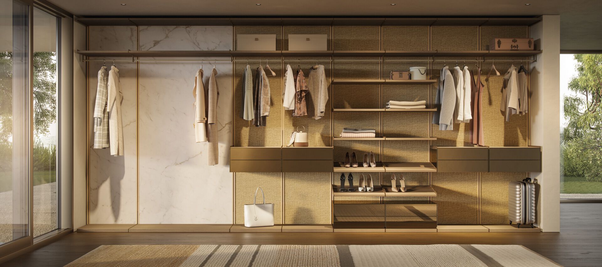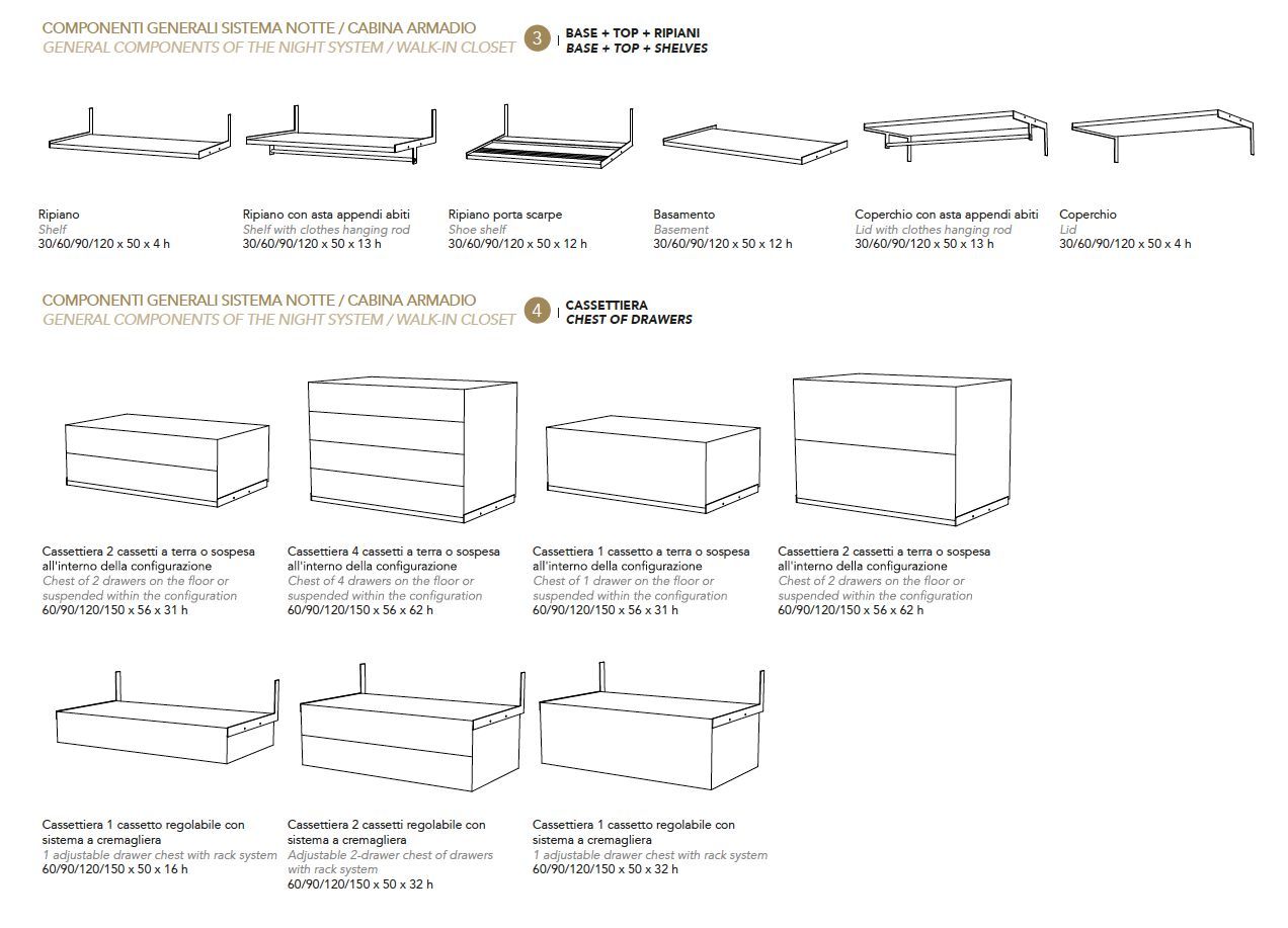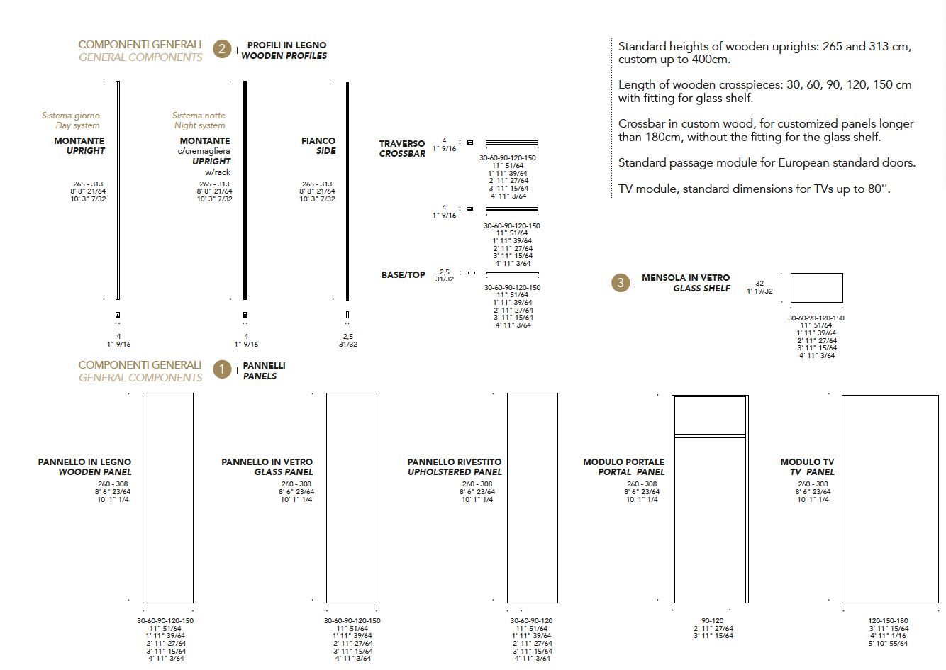 Wally is a modular wall system with a combination of boiseries in various materials.vertical and horizontal profiles in ash with natural or ebony-stained, Accessories for day / night compositions. Supports in Bronze (100M).