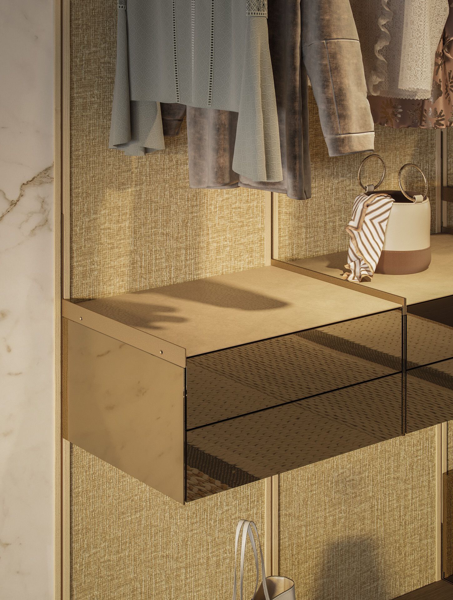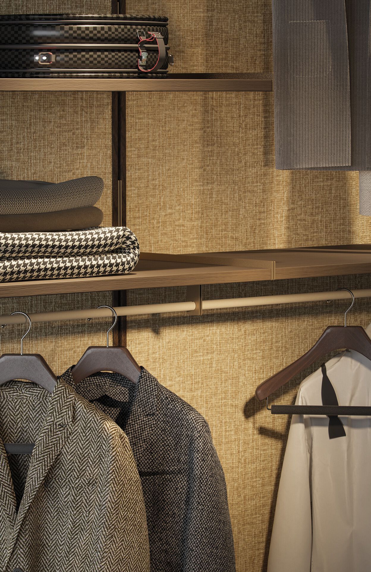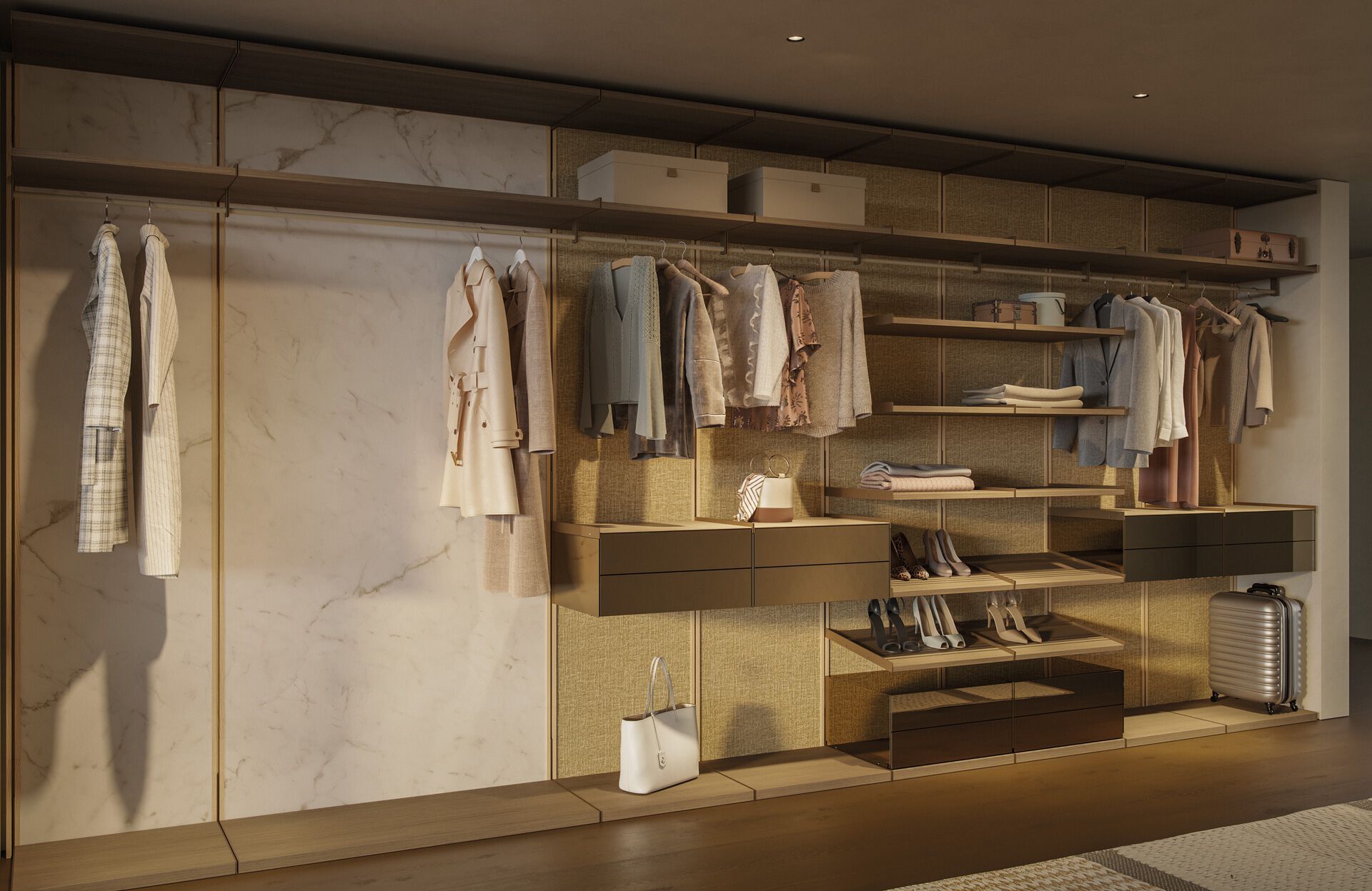 Wally is a modular wall system with a combination of boiseries in various materials.vertical and horizontal profiles in ash with natural or ebony-stained, Accessories for day / night compositions. Supports in Bronze (100M).