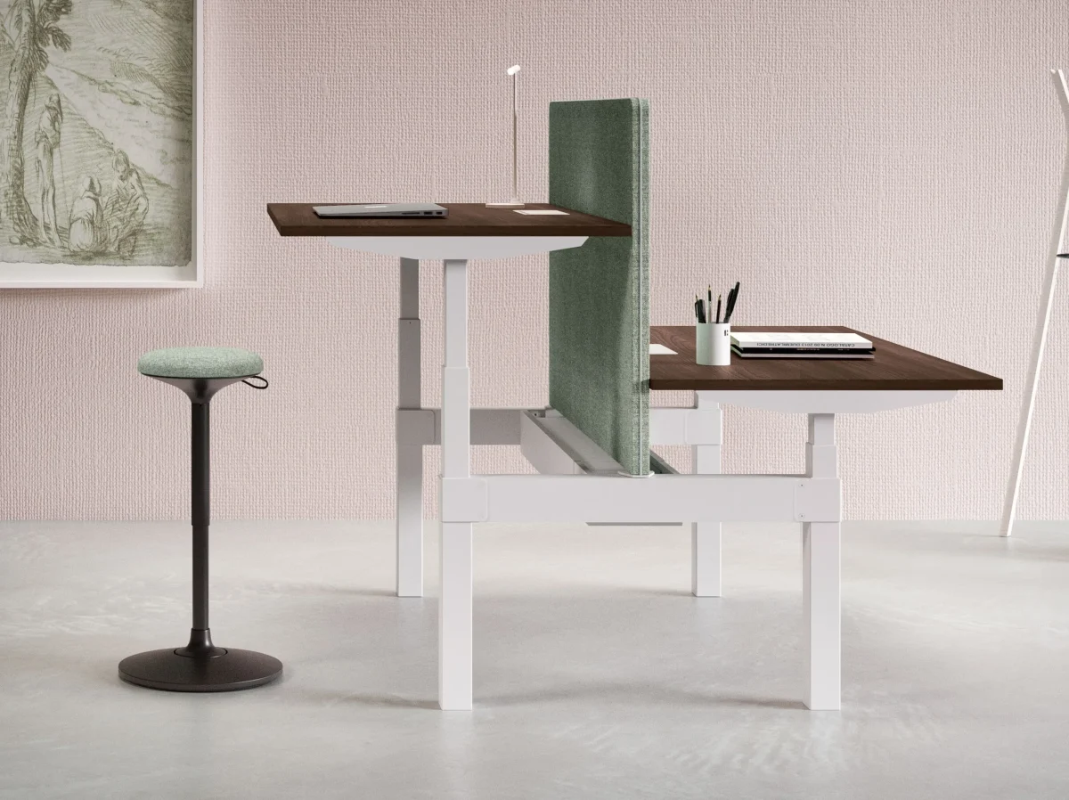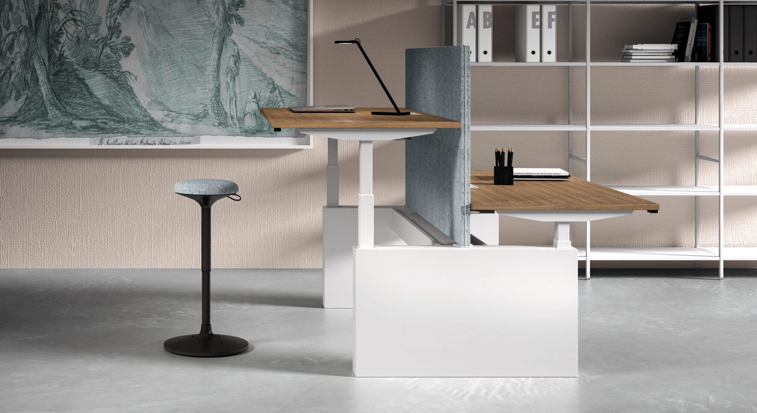 Legs: white epoxy paint finish / Tops: white laminate / Side panel and M10: white laminate Screens: Xpress fabric – Spring yellow