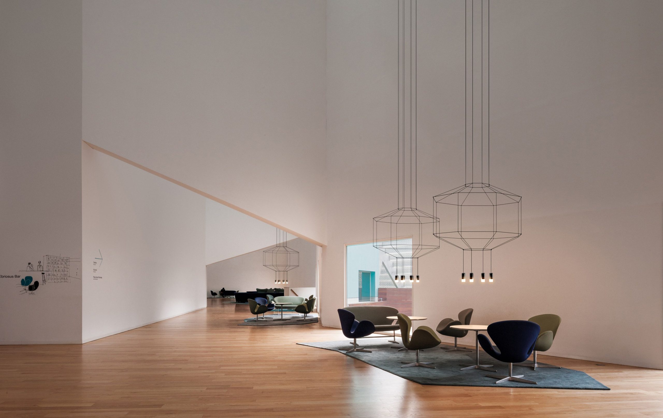 The Wireflow 3D lamps are a system of hanging lamp fittings designed by Arik Levy . The Wireflow 3D lamp is a reinterpretation and reinvention of the classic chandelier fitting. The supporting structure for the Wireflow 3D light fitting is constructed using black electrical cable and 4.5 Watt LED light sources, the lamp is characterised by these very materials which define the collection. The Wireflow collection electrical cables trace three dimensional geometries which despite their large size create a sense of transparency that defines the captivating graphic feel of this lamp fitting. The Wireflow 3D lamp by Vibia is available in 4, 6 and 8 diffuser versions.