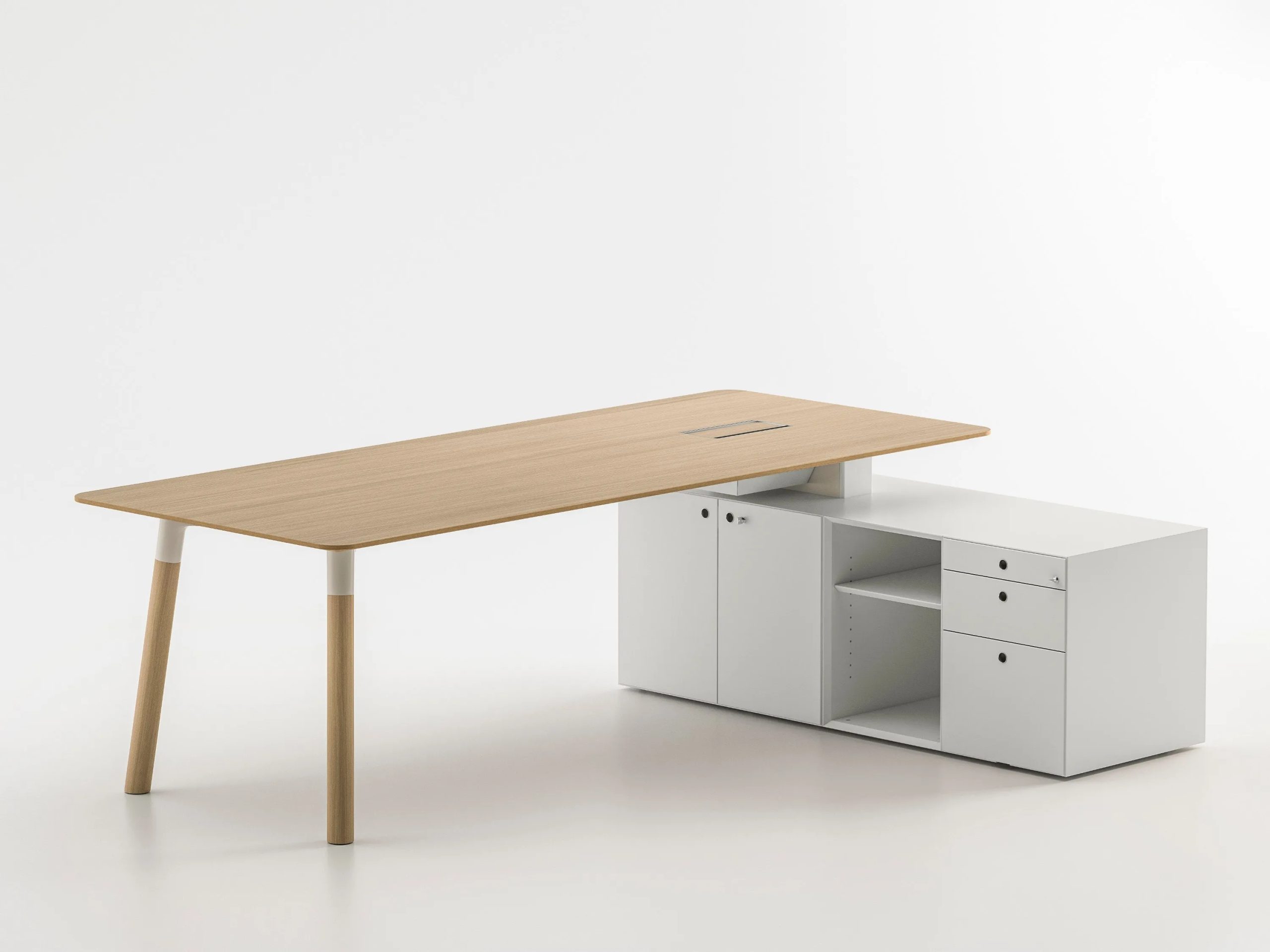 Woods includes large executive and meeting tables, fixed office desks and height-adjustable workstations. A collection that can switch from clerical to executive simply by changing the combination of tops and legs, with an interplay that maintains consistency of design and allows for numerous different layouts.