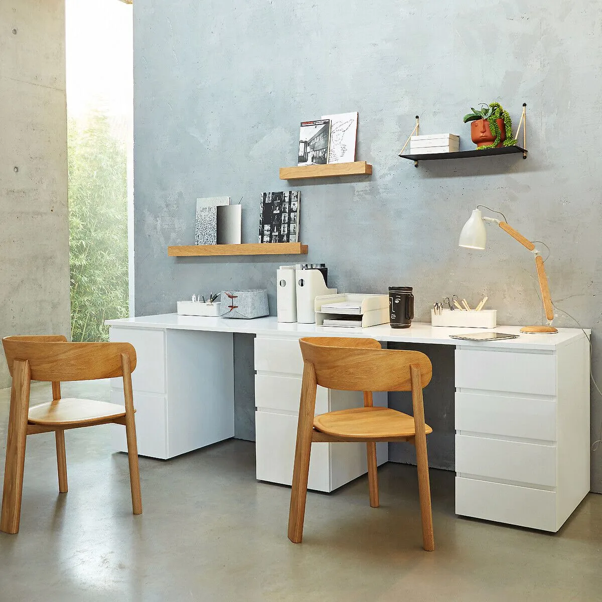 Working is a modular desk. You can coordinate tops, drawer units and base units to create your own workspace.