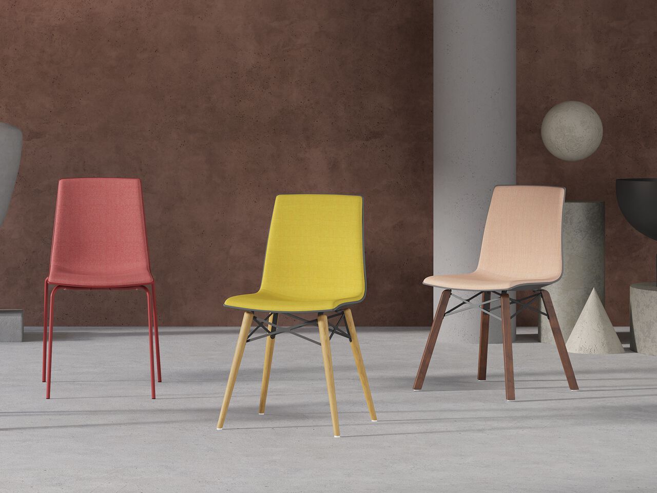 Acts like a joker in venues with its contemporary design and ergonomic back support. Polycarbonate seat exists in shinny transparent and solid colors. The collection is available with a selection of chairs with metal and wooden leg, bar stools with different heights. Available in fully upholstered shell version by the touch of luxurious fabrics. In soft versions, the collection is even more comfortable.
