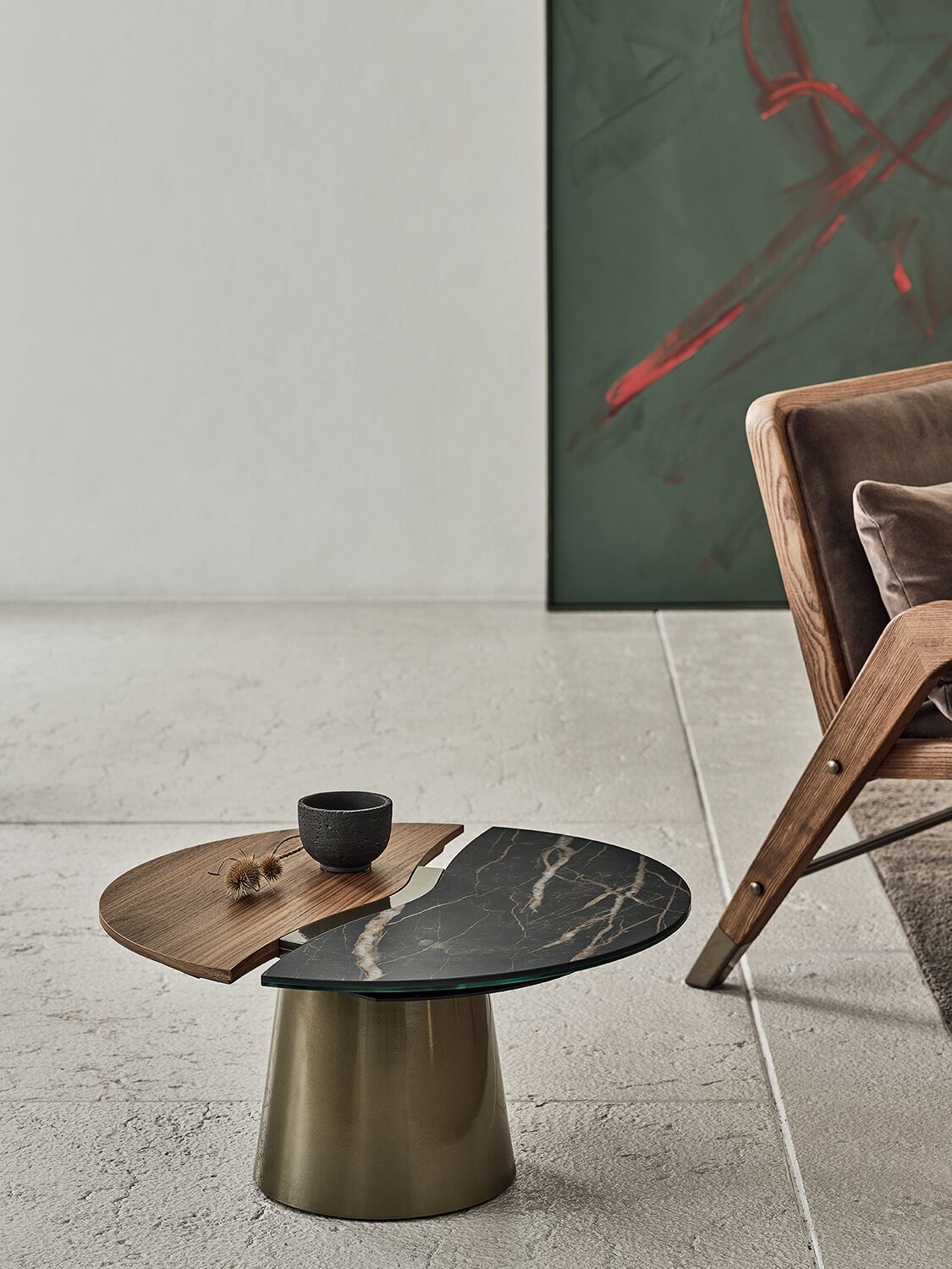 Yang is a coffee table with metal frame and decorative details. Top in Spermarble and Veneer.